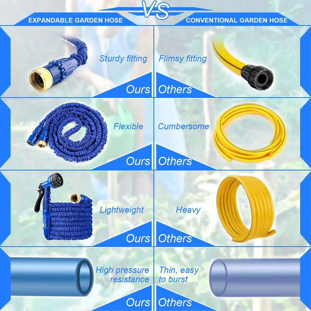 Товар Нормальная длина Удлиненная Длина 25 футов 2,2 м 5,5 м-6,2 м 50 футов 4,2 м 12,5 m-16m 75 футов 6,5 м 18 м-22 м 100 футов 8,5 м 25 м-28 м 125 футов 10 м 30 м-33 м 150 футов 13 м 36 м-40 м 175FT 14,6 м 44 м-47 м 200 футов 16,6 м 48 м-50 мОсобенности:1. Новый расширяемый водяной шланг: когда вода проходит через этот растягивающийся садовый шланг, который быстро расширяется до 3 раз в длину. Когда вода выключена, садовый шланг вернется к исходному размеру. Это хорошо подходит для экономии пространства и удобства хранения.2. 7 функциональных распылительных насадок: Регулировка сопла, которая лучше всего подходит для ваших садовых нужд. Этот садовый шланг подходит для полива травы, цветов, овощей, мытья газона, очистки окон, мытья автомобиля или полов для вашего дома и мастерской, мойки автомобилей, RV, бассейна, лодка и т. Д. Вашим питомцам тоже понравится.3. Долговечность: двухслойный 100% натуральный латексный сердечник, очень прочный, не ломающийся, с новейшей улучшенной сверхпрочной тканью для отличной долговечности.4. Легкий и гибкий: наш расширяемый (растягивающийся) садовый шланг не легко запутывать, скручивать или выщипывать. Светильник Утяжеленный, поэтому не утомляет ваше тело даже при переноске на большое расстояние.5. Совместимость, длительный срок службы: подходит для большинства насадок распылителя. Перед использованием внимательно проверьте садовый шланг. Если вы обнаружите какие-либо проблемы во время использования, пожалуйста, свяжитесь с нами как можно скорее, мы предоставим вам удовлетворительное решение.Как использовать с спринклером:1. Поверните клапан ВКЛ/ВЫКЛ в конце водяного шланга в выключенное положение.2. Поверните воду у источника, и ваш водяной шланг расширится до максимальной длины, при первом использовании водяного шланга, рекомендуется сначала заполнить и удлинить шланг и слегка растянуть мотыгу, чтобы высвободить герметичность во внешнем сложенном материале, затем выпустить воду и заправить, чтобы использовать нормально.3. Прикрепите спринклер к клапану ВКЛ/ВЫКЛ.4. Поместите разбрызгиватель в нужное место во дворе или в саду.5. Направьте сопло разбрызгивателя подальше от вас и включите/выключите клапан в положение on и уйдите, ваш разбрызгиватель будет работать таким же образом, он работает с любым обычным шлангом.Защитные меры:Не оставляйте воду включенной и шланг под давлением, когда он не используется.Сливайте шланг летом и держите его в форме как можно больше, когда вы его не используете.Храните шланг зимой в состоянии Слива шланга полностью, так как оставшаяся вода может замерзнуть, повреждая шланг.Посылка включает в себя:1 х садовый водяной шланг1 x насадка1 х соединитель крана