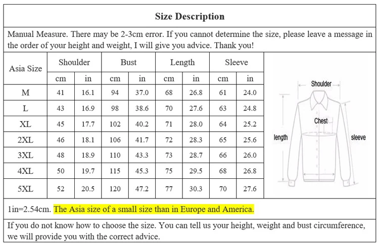 4. Мы отправим посылку в течение 3-7 дней после оплаты. Пожалуйста, укажите свой вес и рост при размещении заказа, если вы не уверены в размере. Могут возникнуть в связи с использованием различных способов снятия мерок возможны погрешности на 1-3 см (1 дюйм = 2,54 см 1 см = 0,39 дюймов).