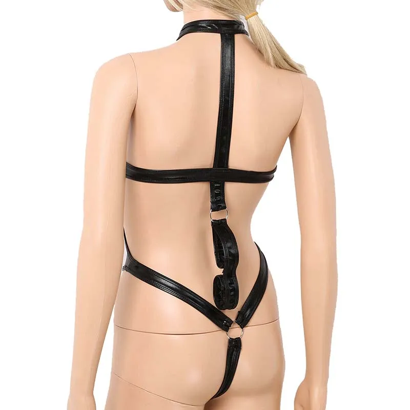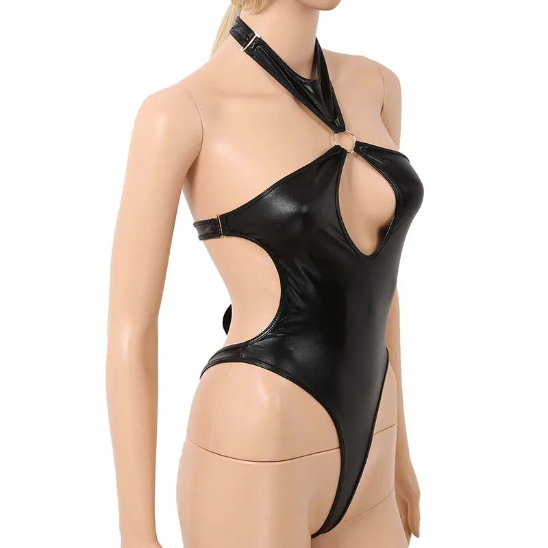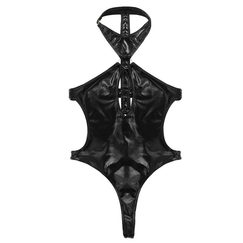 Для женщин Цельный мокрым эффектом со стрингами задняя удерживающие Напульсники Костюм Тедди из искусственной кожи боди нижнее белье
