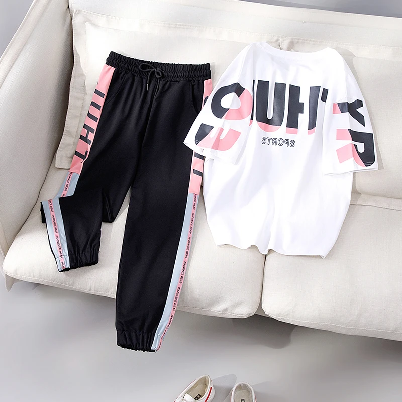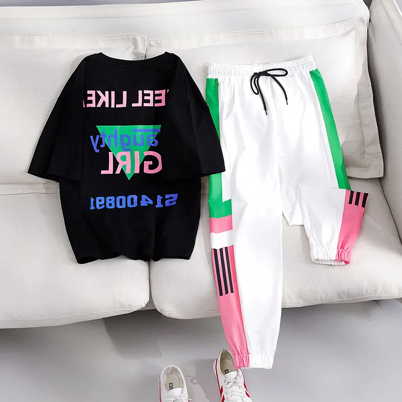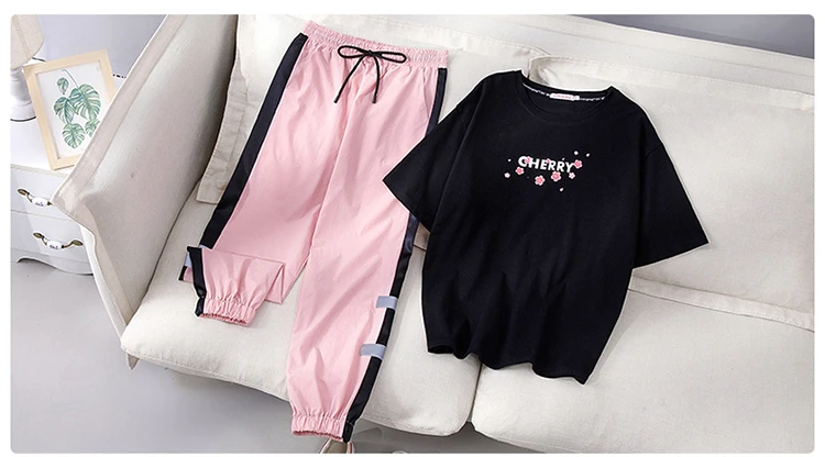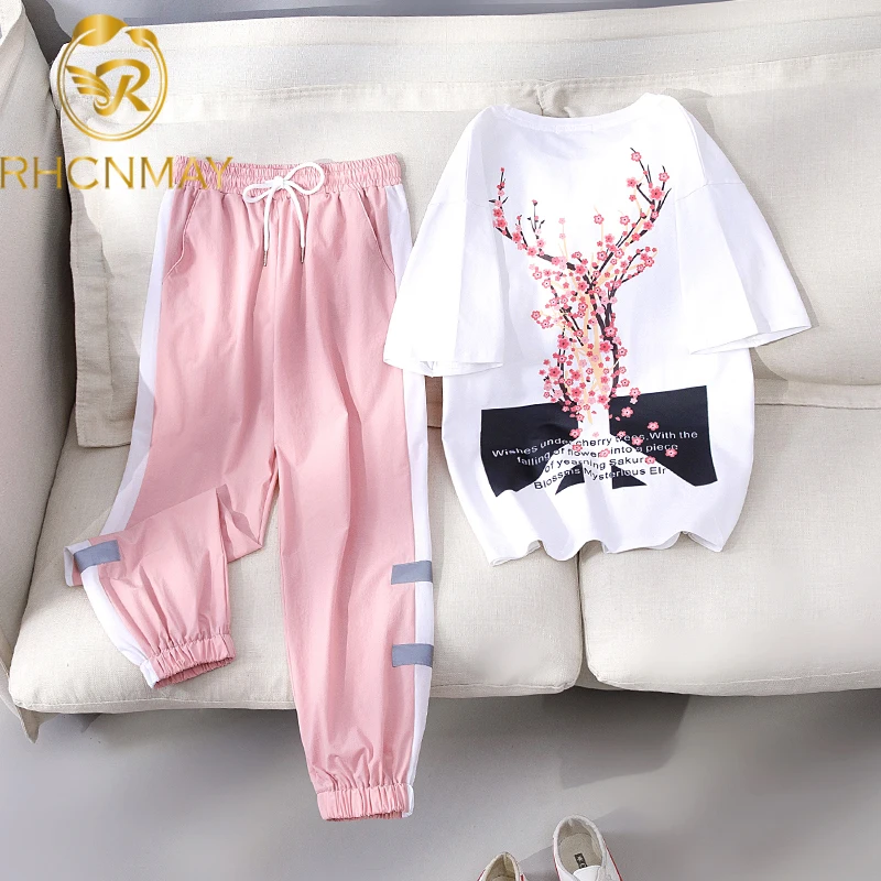 Спортивный костюм женский из двух предметов, Повседневная футболка с цветочным принтом и штаны с эластичным поясом, лето 2020