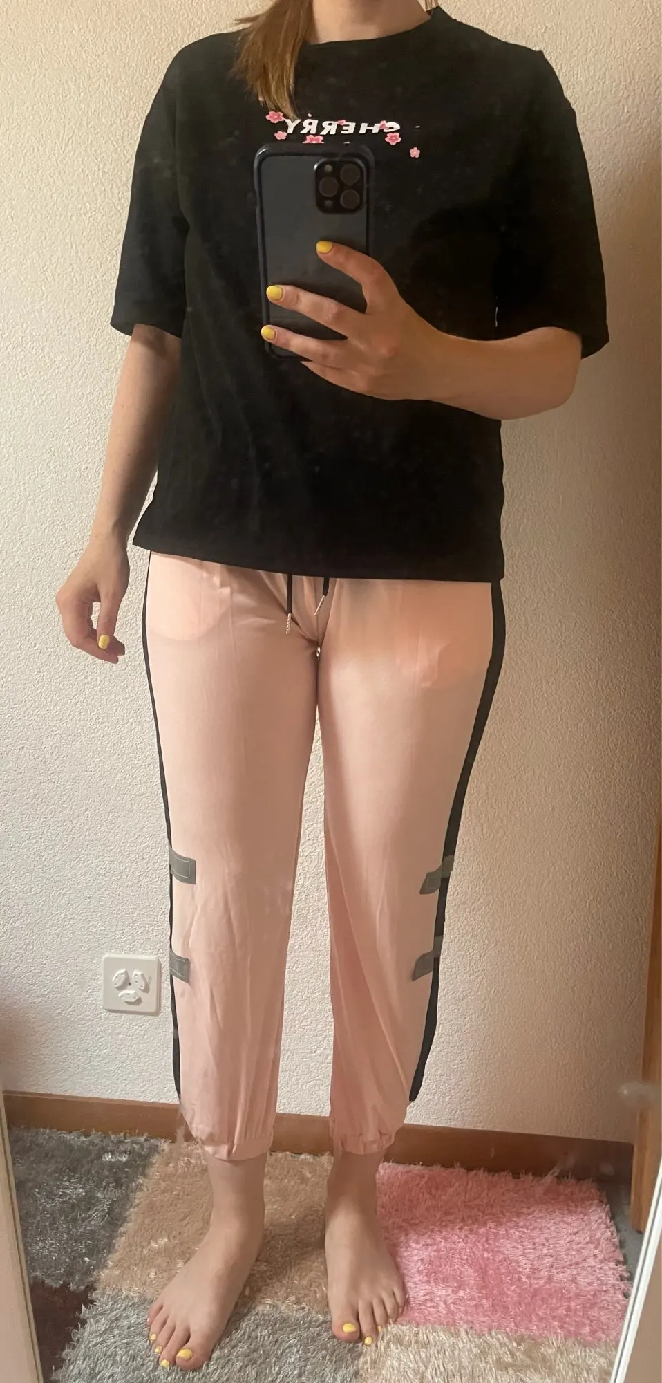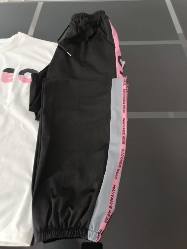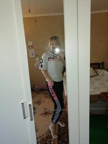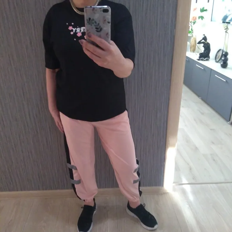 футболка нормальная, а вот штаны созданы для шлюх. Через них видно абсолютно всё, не только трусики, но и каждый сантиметр ног. Носить их видимо надо на что-то, но а смысл брать костюм на лето если надо носить с чем-то и умирать от жары.