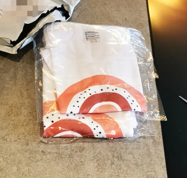 La impresión de las camisetas es idéntica a la foto.La talla s talla grande y la parte de la camiseta abajo es estrecha.Llego muy rápido.