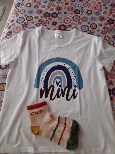 Очень красивая футболка, ткань отличная, не заметна. Цвета такие, как на фото. Размеры точно описаны, но я желал заказать размер M и он немного великоват для меня. Для маленькой тоже немного великовата, но она вырастет. Доставка занимает месяц, быстрая доставка, и мы упакуем товар. Продавец отправил подарок, пара носков.