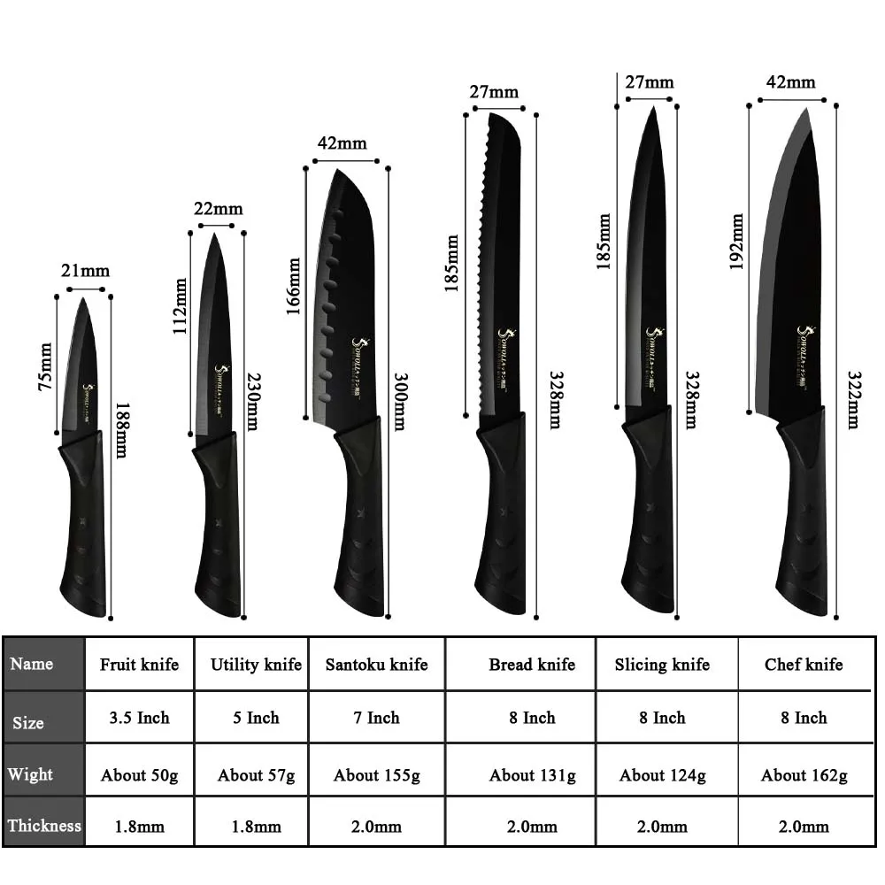 1x3,5 дюймов нож для очистки овощей и фруктов 1x5 дюймов нож бытовой 1x7 дюймовый нож Santoku 1x8 дюймов нож для хлеба 1x8 дюймов нож для нарезки 1x8 дюймов нож шеф-повара 6 x нож оболочки (1 шт.); 8 карманов в рулоне
