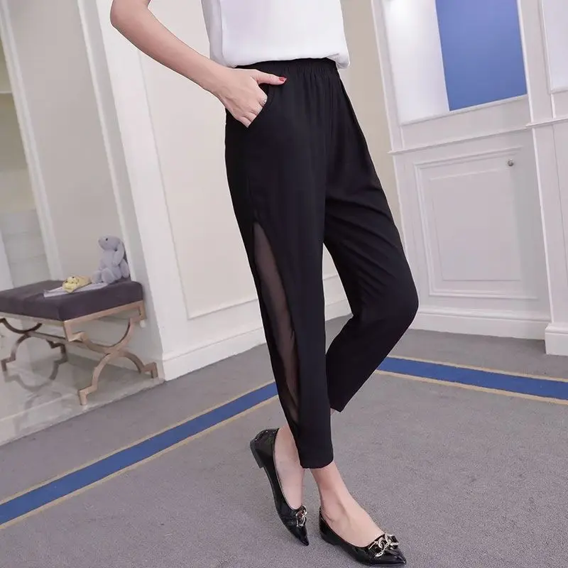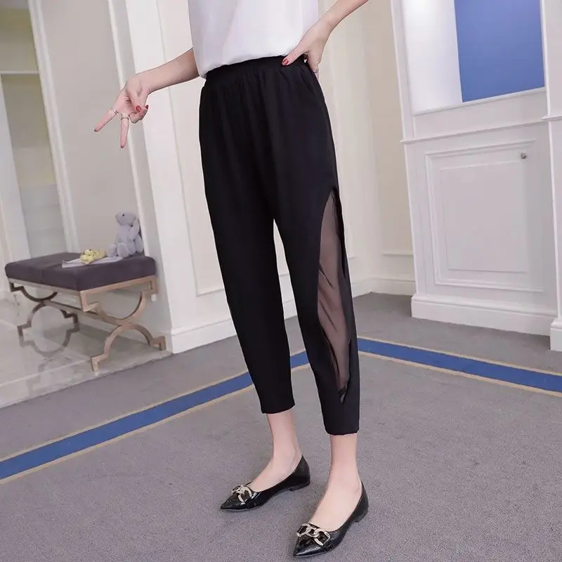 Женские шифоновые шаровары, черные дышащие брюки-карандаш до щиколотки, с высокой талией и кружевом, повседневные, лето 2020