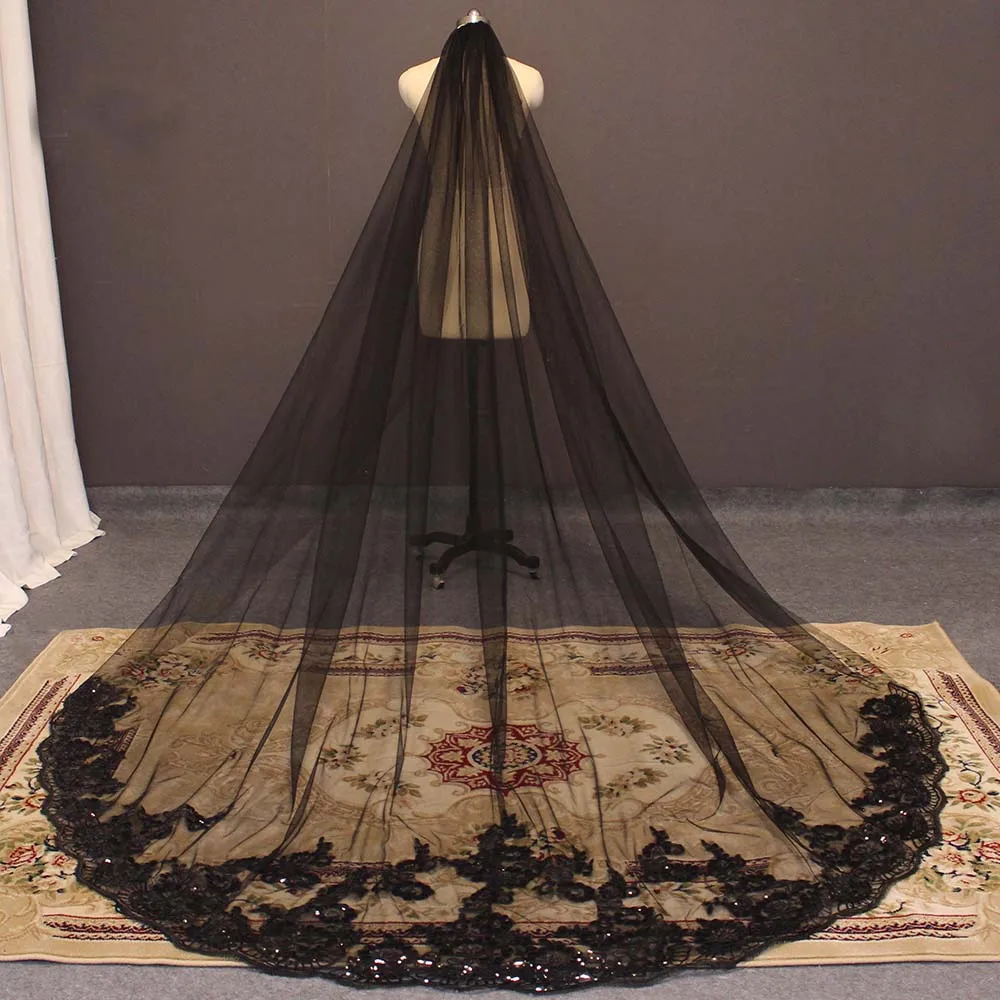 Черная длинная свадебная вуаль с блестками, кружевная, Соборная, 2T...