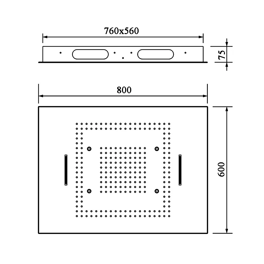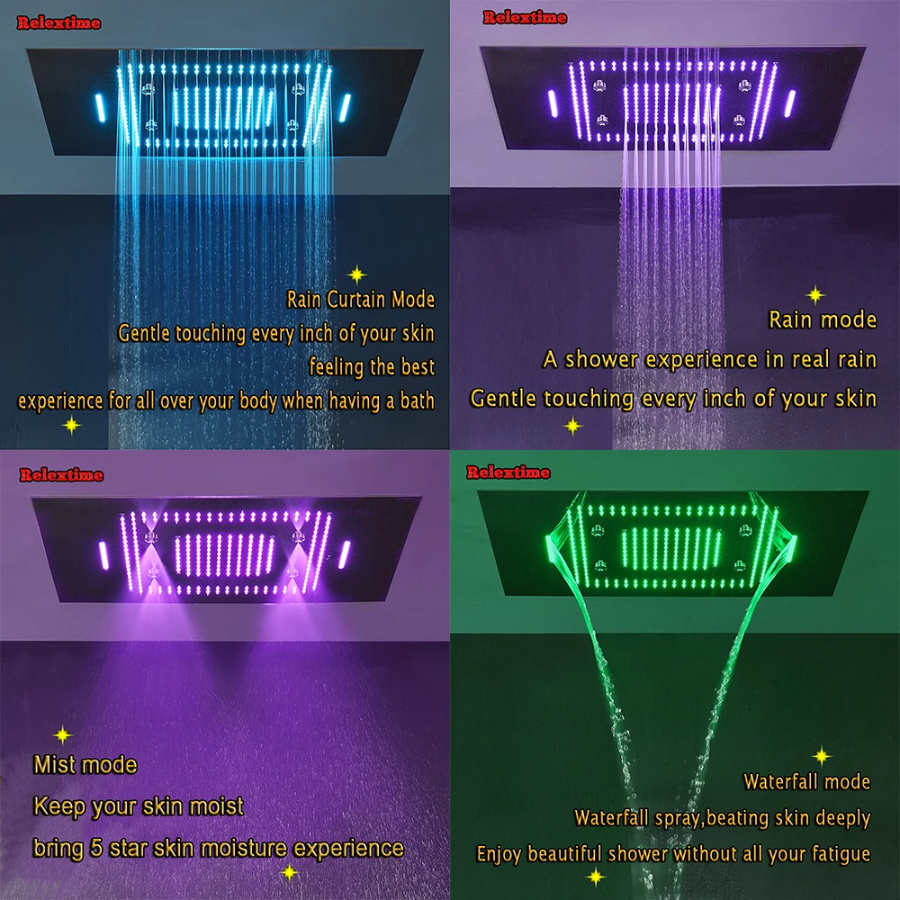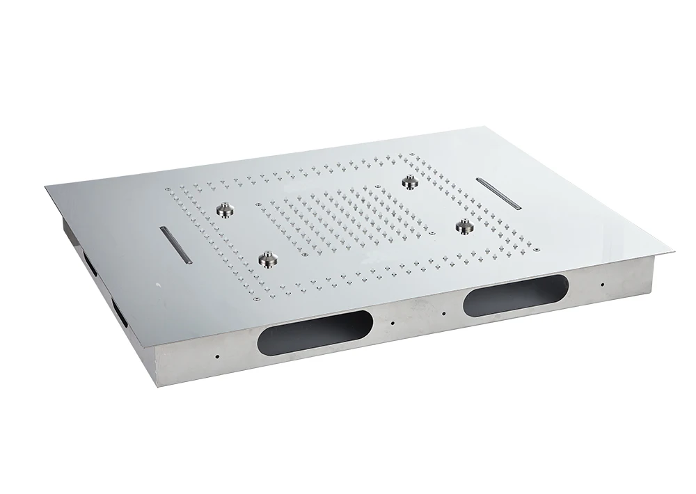 Он сделан из SUS304 и зеркальное покрытие, Размер 800x600 мм, есть 4 функции включают: дождь, водопад, занавес и Брызга тумана, ювелирные изделия с Роскошные светодиодный свет, светодиодный светильник подключен к источнику питания для производства стабильного электричества, поэтому светодиодный светильник имеет длительный срок службы, насадка светится, Вода течет из светящейся сопла, она очень красивая и очень романтичная, протестирована с 3 бар давлением воды, Скорость потока: дождь: 15л/м; Водопад: 15л/м; занавес: 15 л/м; Распылительный туман: 9 л/мин, Он был встроен в потолок, когда мы устанавливали его, размер отверстия потолка 765*565 мм. Напряжение питания, используемое для душевой головки, составляет 90 ~ 260VAC.