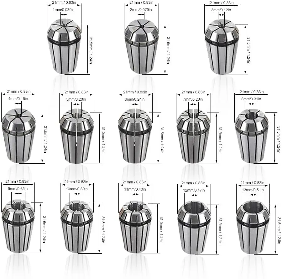 Набор цанг ER20, 13 шт., от 1 до 13 мм, точность 0,008 для фрезерных станков с ЧПУ