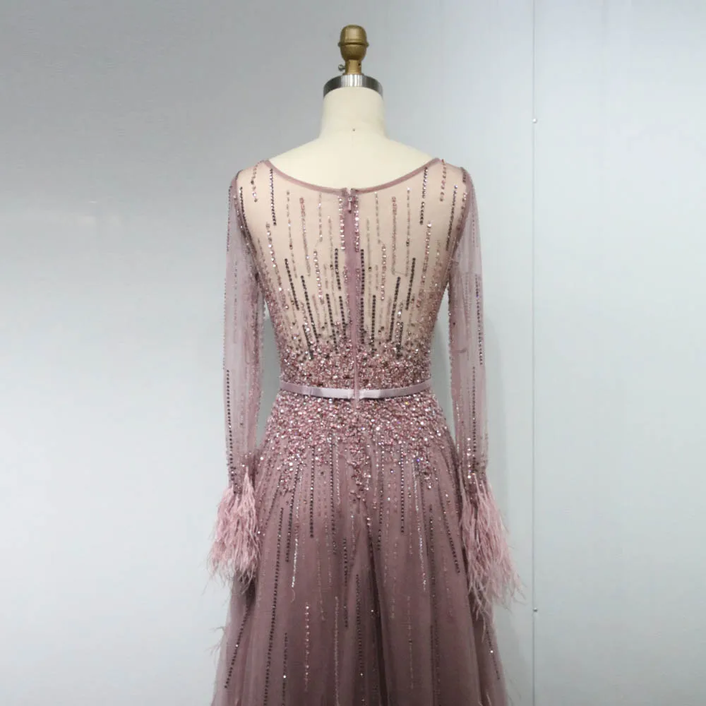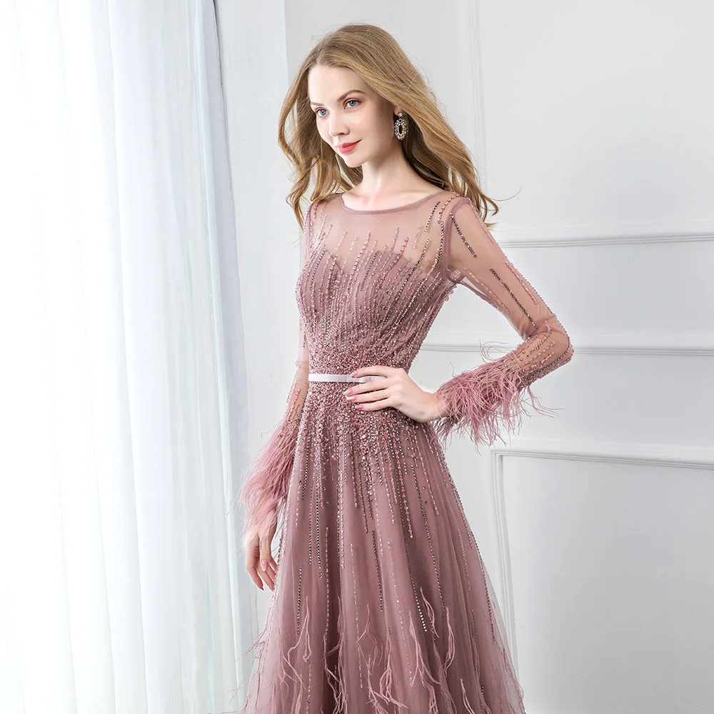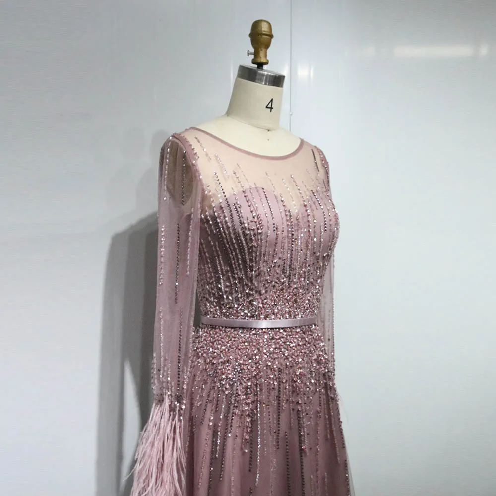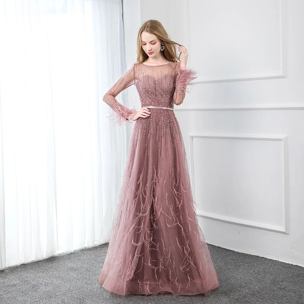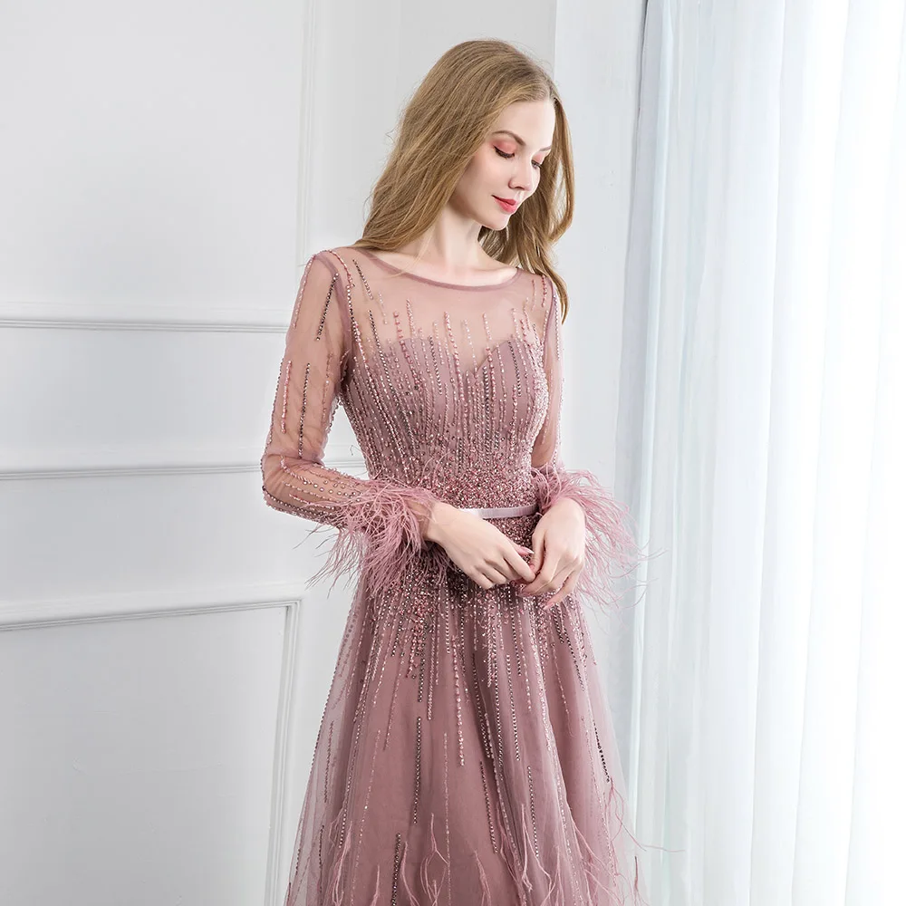 Пыльно-розовые вечерние платья с длинным рукавом и перьями, длинное вечернее платье из тюля, с кристаллами, расшитое бисером, женское вечернее платье, дубайское платье