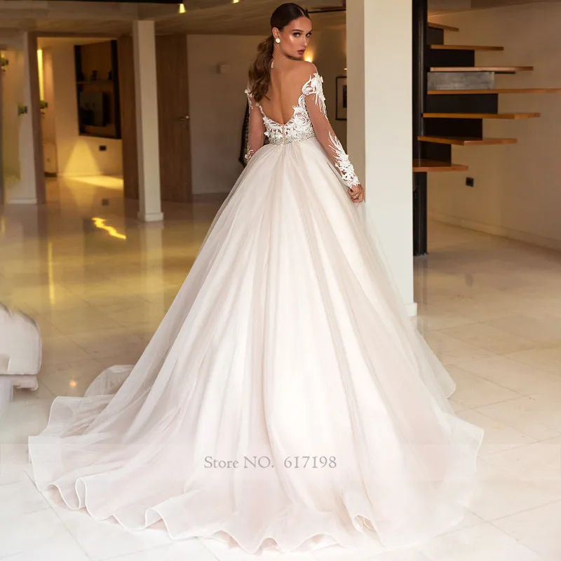 Винтажное кружевное платье с аппликацией глубоким декольте с длинным рукавом и бусинами ТРАПЕЦИЕВИДНОЕ Тюлевое свадебное платье Свадебные платья vestido de noiva 2022