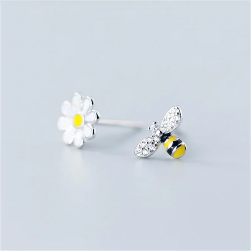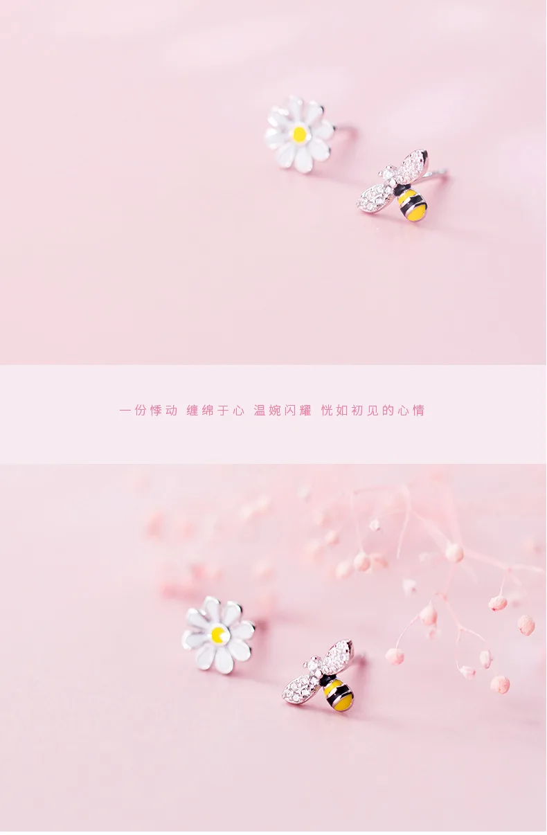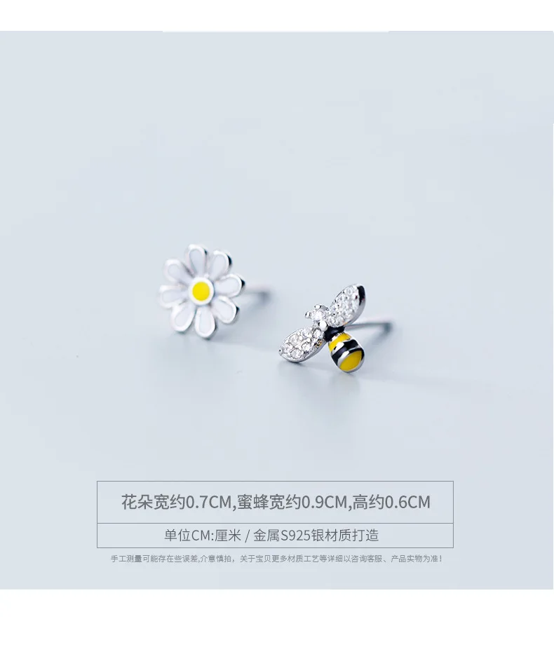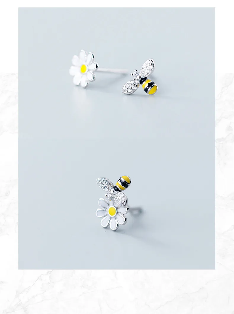 Асимметричные серьги-гвоздики из серебра 925 пробы, с цветком, Пчелкой и маргариткой