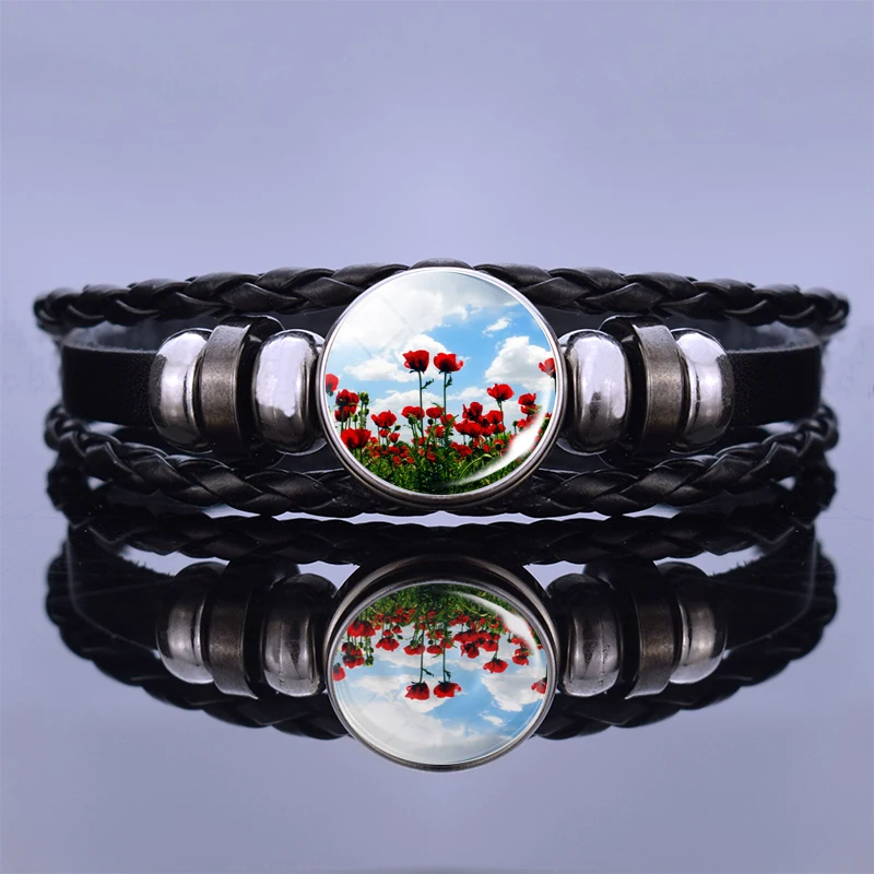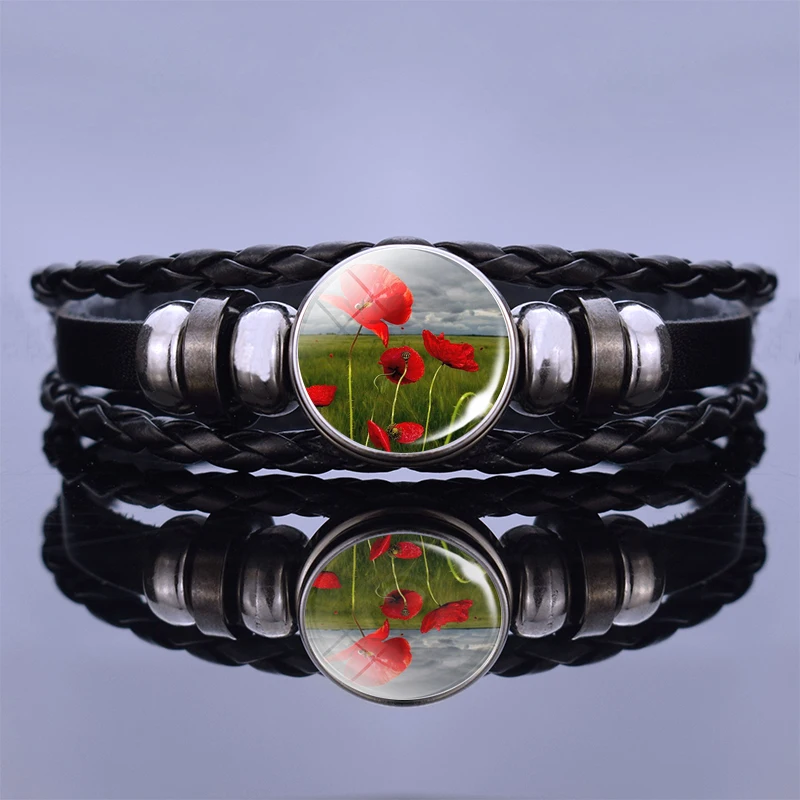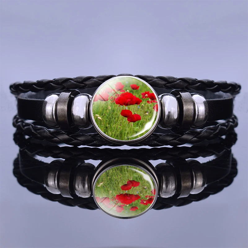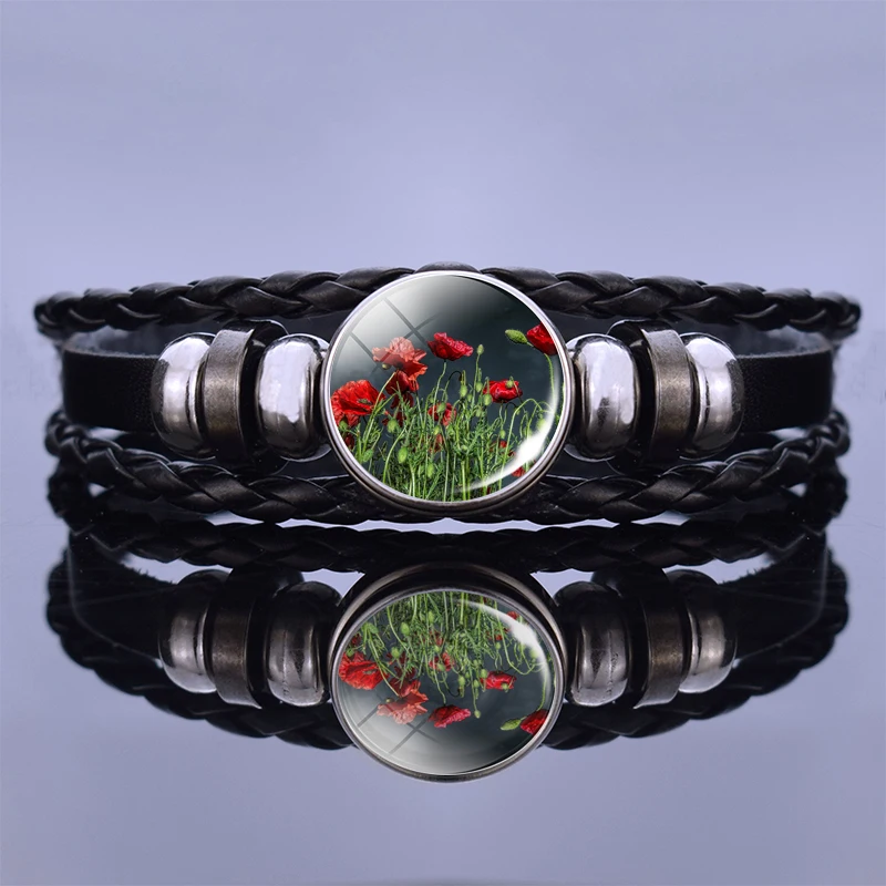 Браслет Poppy с узором, черный кожаный тканый браслет, художественная картина, бижутерия со стеклянными кабошонами, модный Панк мужской браслет в подарок