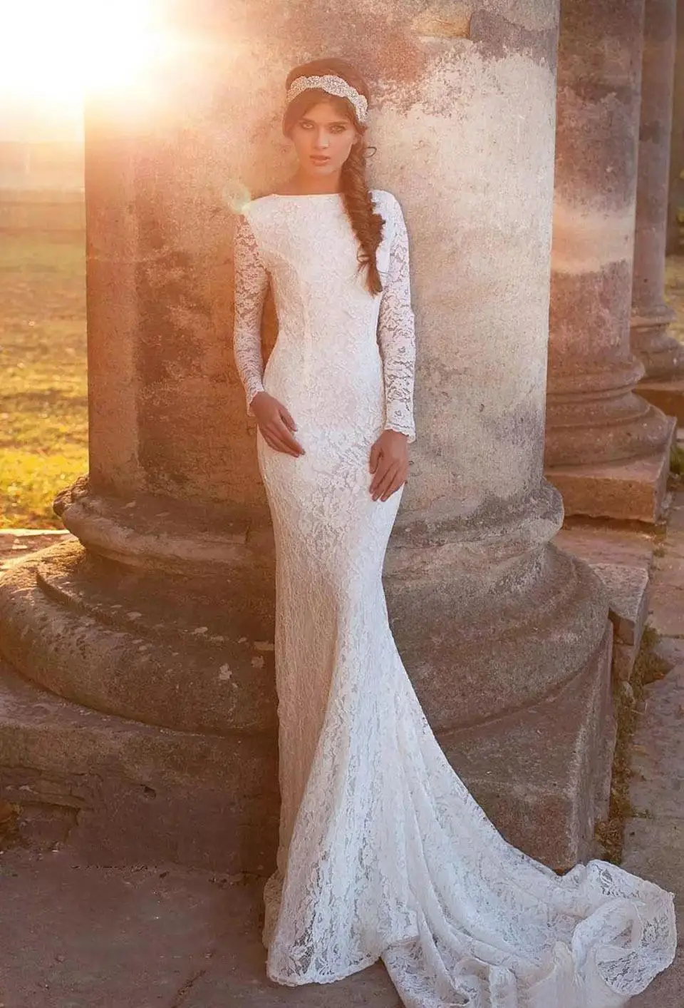 Оптовая продажа, элегантные кружевные свадебные платья русалки с дл...