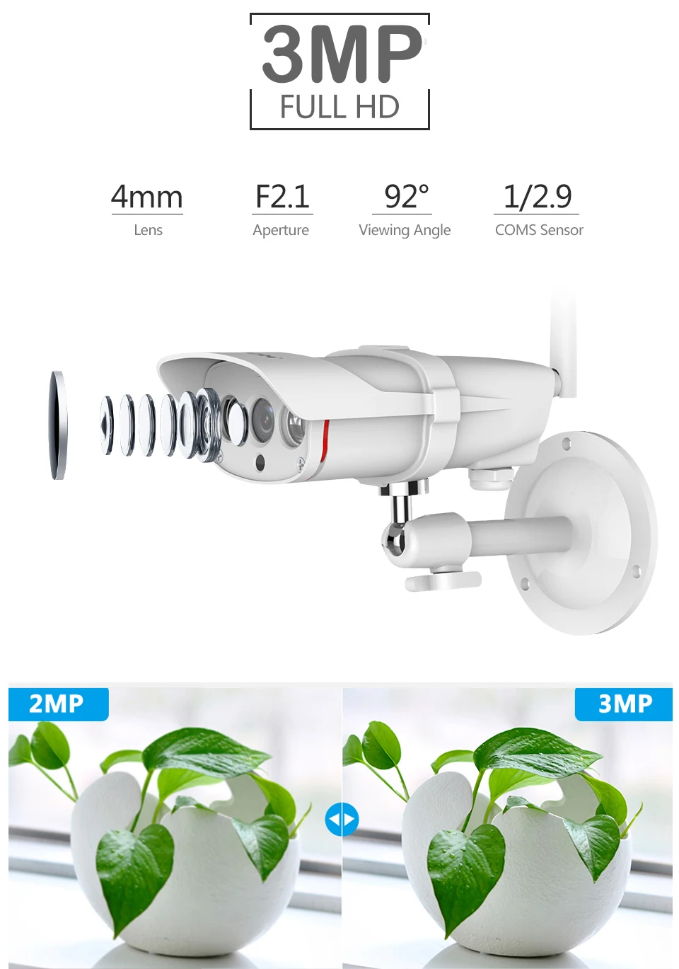 3MP Full HD4 мм объектив | F2.1 диафрагма | Угол обзора 92 ° | 1/2.9 CMOS датчик