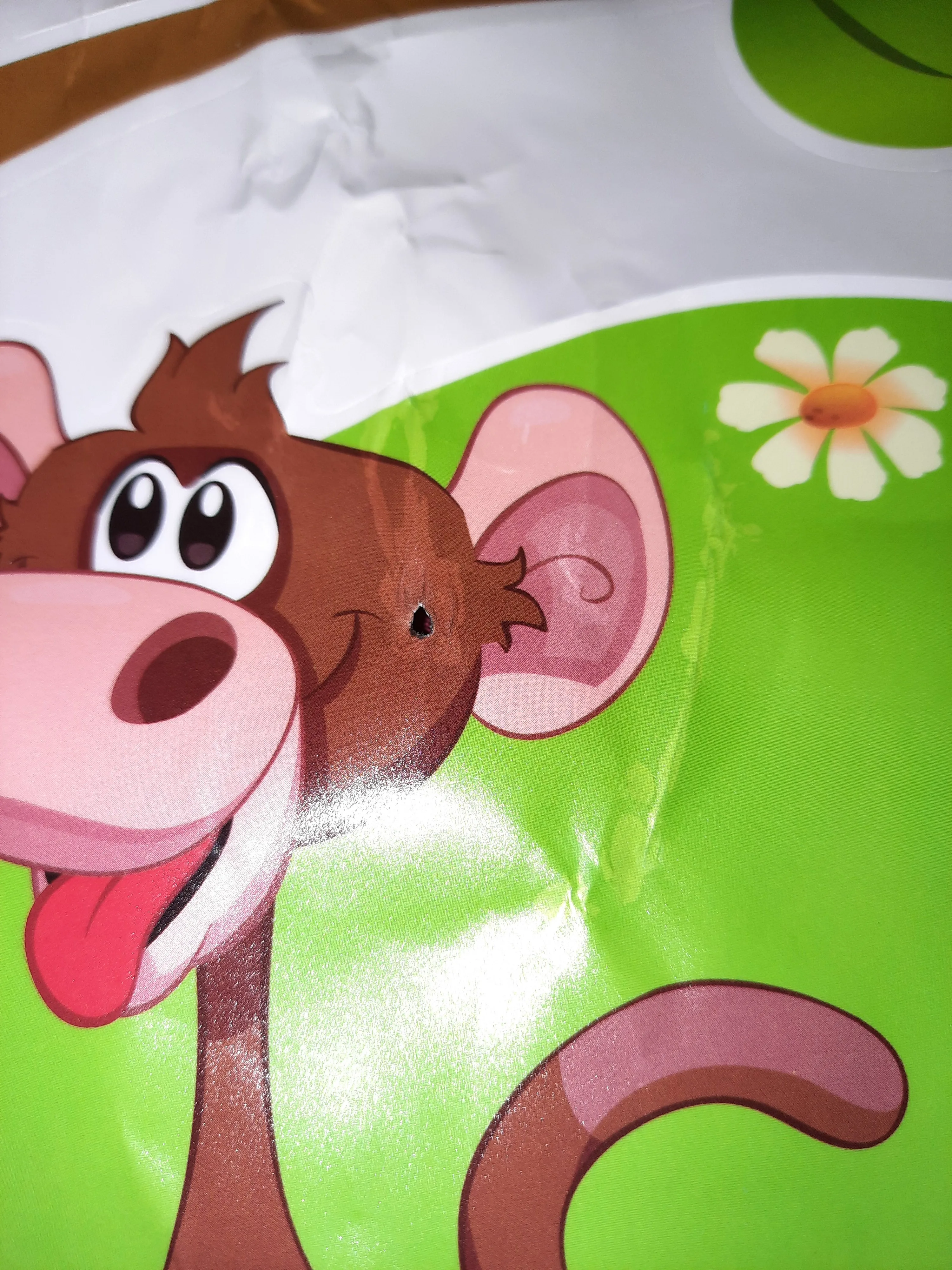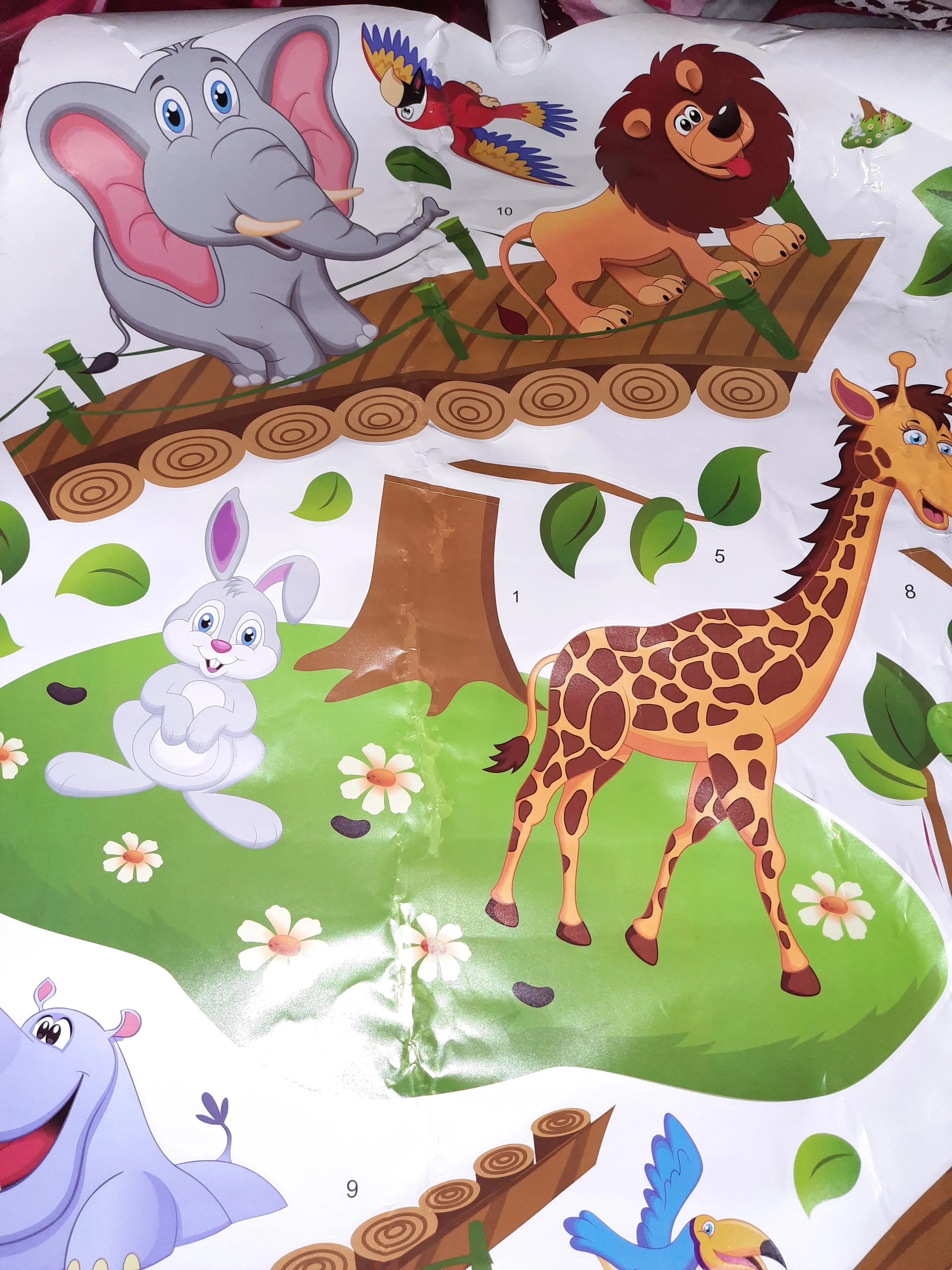 Пришел товар мятый и не знаю как приклеиться. На обезьяне дырка. Пальма отклеилась,может это не критично. Картинка большая . Если бы все пришло целым думаю было бы лучше . А так в общем нравиться.Жаль что у обезьяны дыра,что то надо будет придумывать,чо бы не просвечивалась стена. Закрашу фломастером.