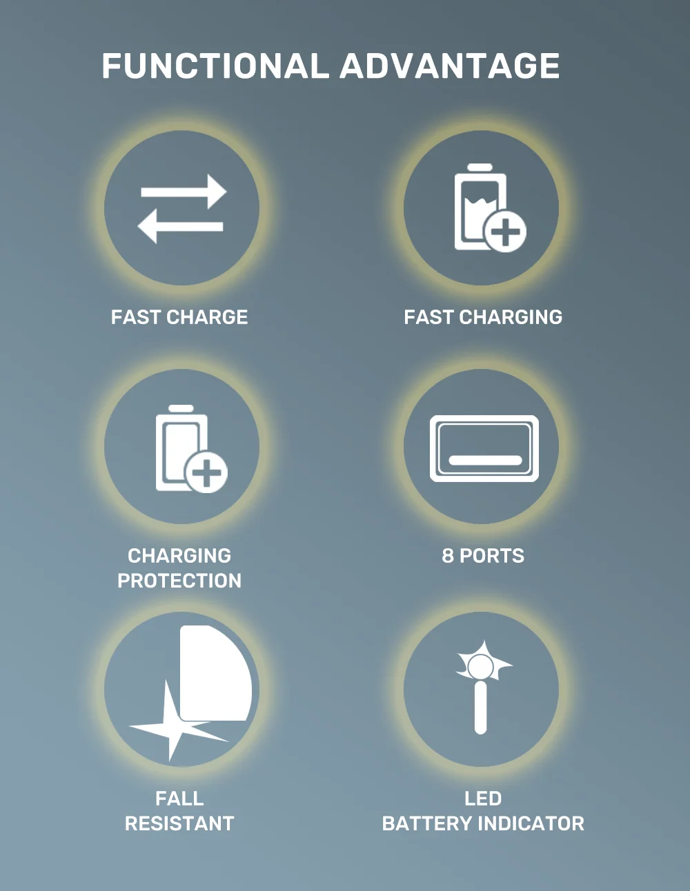 1. С цифровым дисплеем, показать вам рабочий статус каждого usb-порта.2. Множественные встроенные гарантии полностью защищают от перегрузки по току, перезарядки и перегрева для безопасной и быстрой зарядки.3.8 портов USB зарядное устройство, поможет вам заряжать ваши электрические устройства в одном месте одновременно.4. Компактный, портативный и стильный дизайн, чтобы сохранить ваш рабочий стол хорошо организованным и кабельным без хаоса.5. Может автоматически распознавать ваши устройства и гарантировать более быструю и эффективную скорость зарядки.6. Возможность быстрой зарядки телефона или планшета дома.7. Совместимость с: подходит для Samsung, iphone, Xiaomi или других смартфонов и планшетных ПК