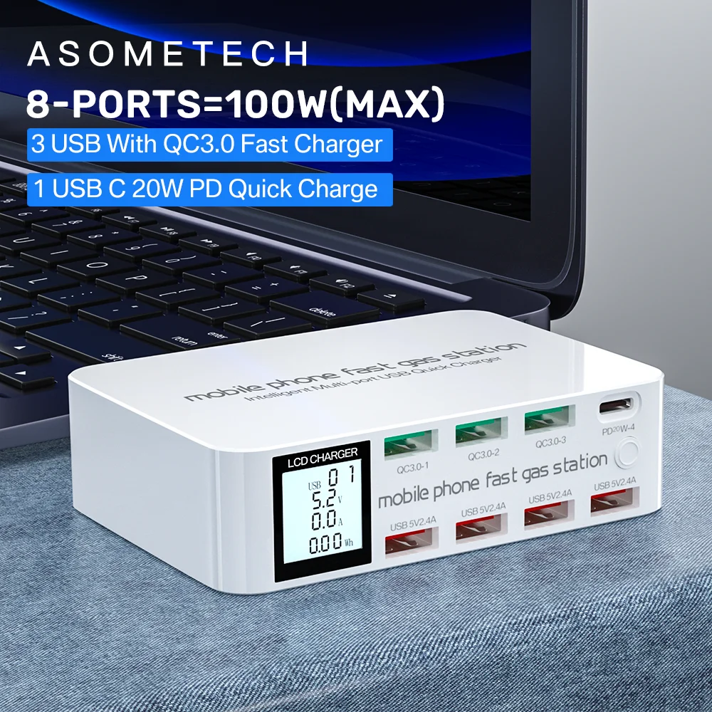 Быстрое зарядное устройство USB QC3.0 PD3.0, быстрая зарядка, зарядная станция для телефона с ЖК-дисплеем, 8 портов, зарядное устройство для iphone, Android