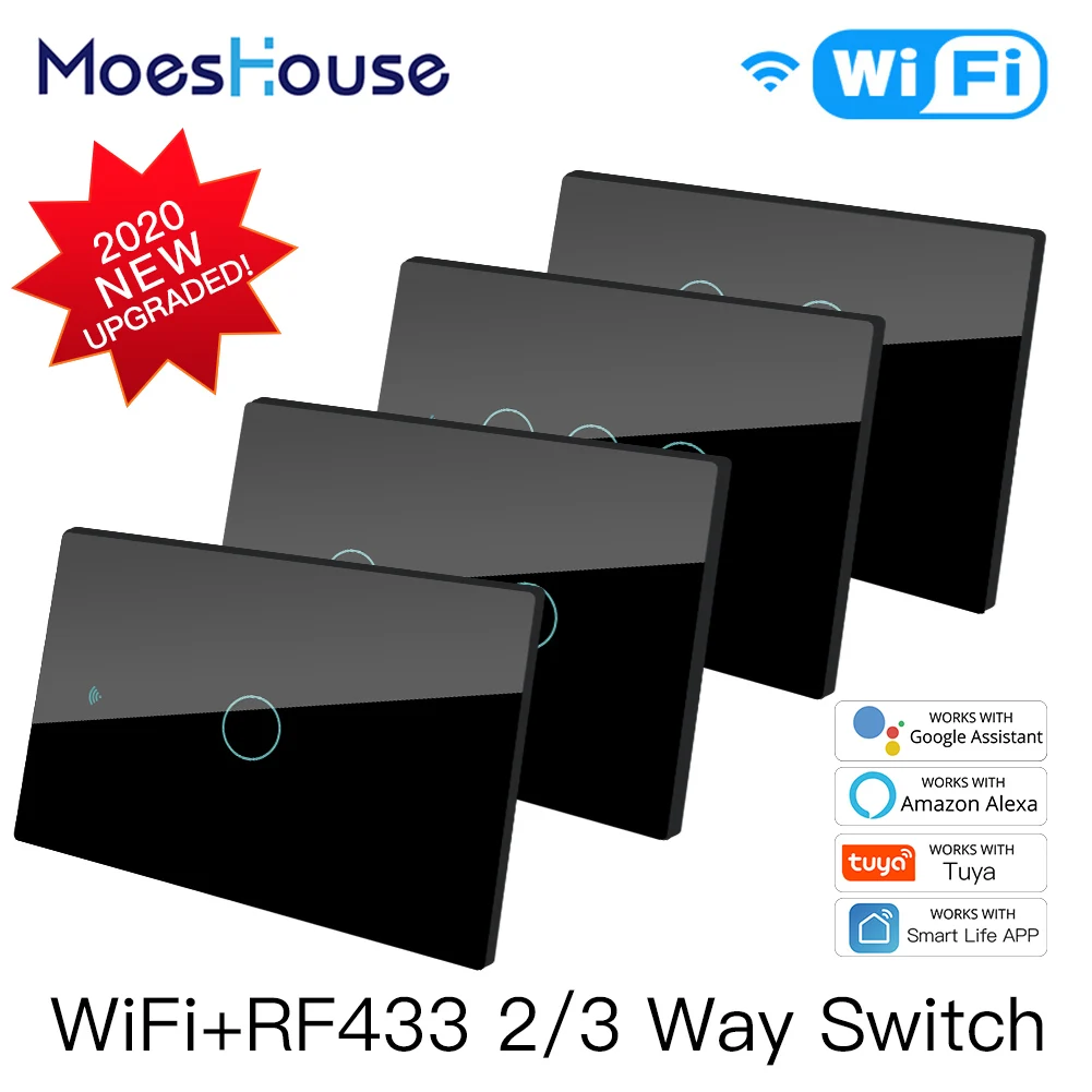 Wi-Fi настенный сенсорный выключатель Умный светильник переключатель RF Беспроводной приложение Smart Life/Tuya "заводные челюсти"-Управление ассоциации приложение реле статуса и Подсветка светильник будет выключаться через пульт дистанционного управления Управление работает с Amazon Alexa,Google Home, 1/2/3/4 Gang Изготовитель: MoesHouse