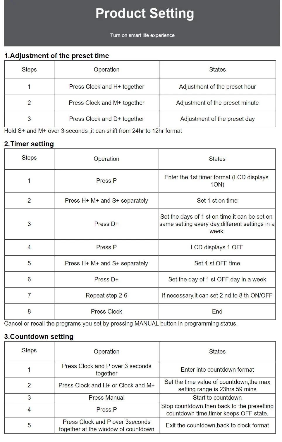 1. Легко читаемый ЖК-дисплей, светодиодный индикатор. 2. Мимим 1 секундный интервал. 3,8 программы ВКЛ/ВЫКЛ в день, 15 комбинаций в неделю. Программируется 4,24 часов/7 дней в неделю. 5. Функция обратного отсчета. Макс. 24 часа обратного отсчета до выключения. 6. Встроенный аккумулятор для экономии памяти при отключении питания. 7. Повторите программы с 8 настройками вкл/выкл и установите вкл/выкл вручную. 8. Идеально подходит для домашнего использования в панеле.