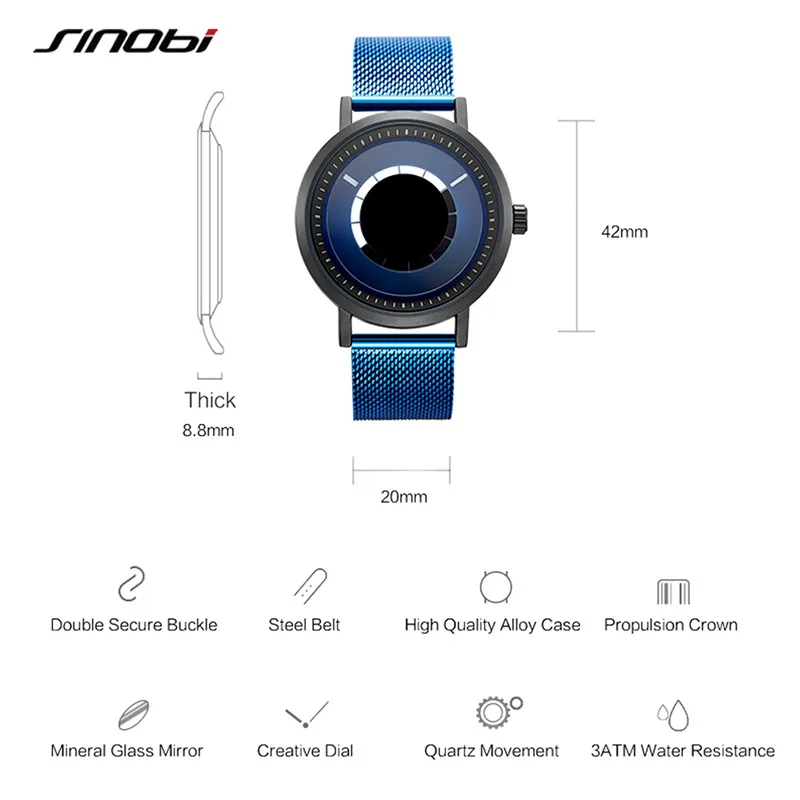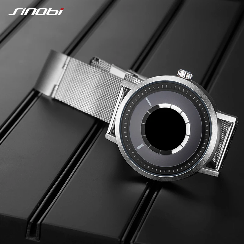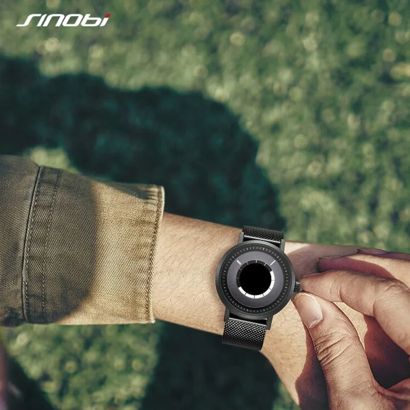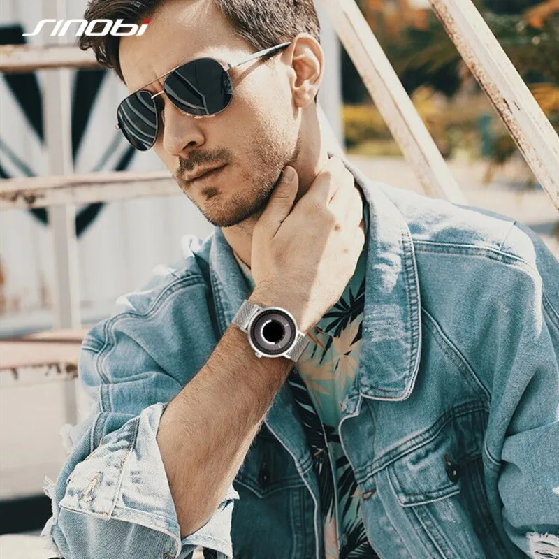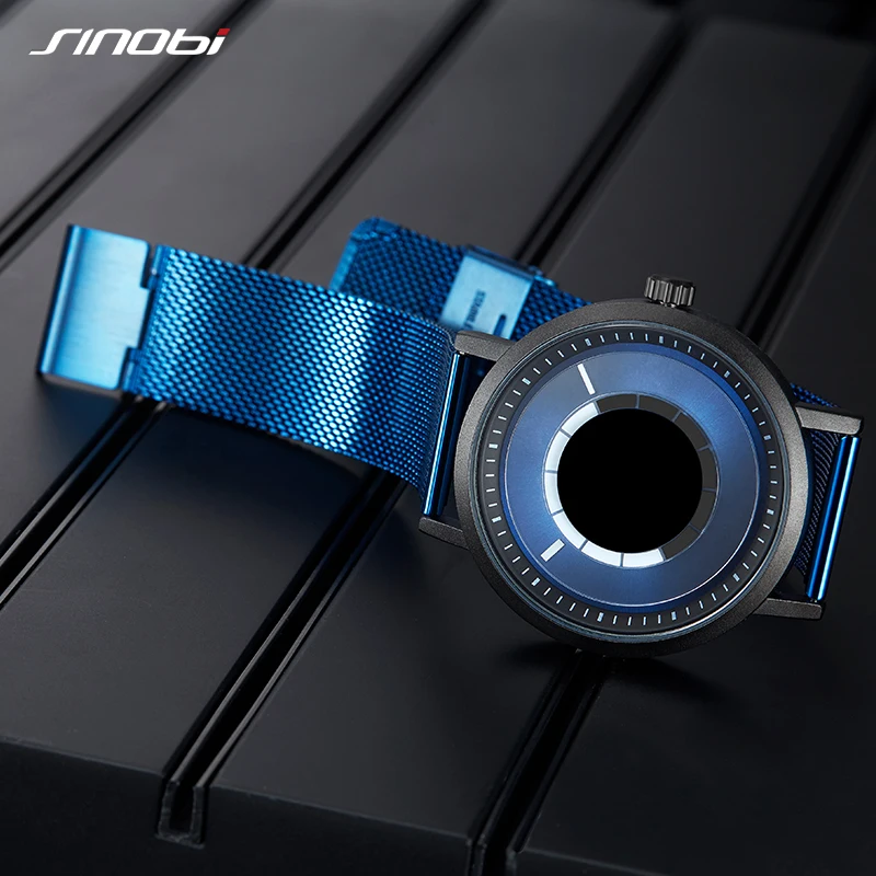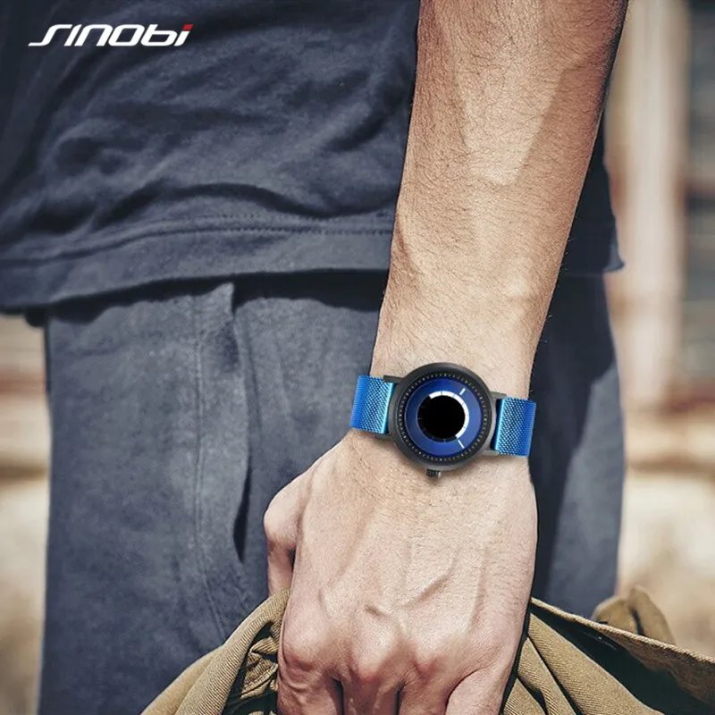 Новые уникальные креативные часы Sinobi с вращением, Мужские кварцевые наручные часы со стальным сетчатым браслетом, Спортивные Повседневные синие мужские часы, мужские часы