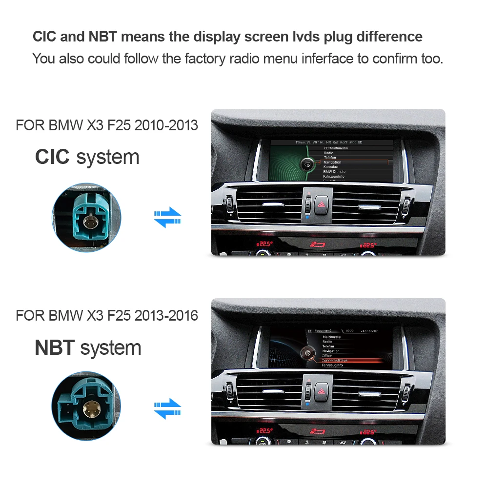 >>> Примечание: у CIC и NBT просто есть разница между штекерами lvds экрана, остальные одинаковые. >>> Выберите год выпуска автомобиля или оригинальное экранное меню заводского головного устройства. >>> CIC означает, что штекер LVDS дисплея 4pin >>> NBT означает, что штекер LVDS дисплея 6pin >>> BMW X3 F25 X4 F26 2011-2013 (4-контактная система LVDS CIC) >>> BMW X3 F25 X4 F26 2014-2016 (6-контактная система LVDS NBT)