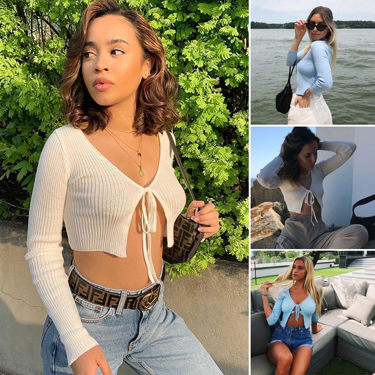 Новинка, Женская Сексуальная футболка с глубоким вырезом, открытой грудью, бантом и длинным рукавом, топы, облегающие короткие рубашки с открытым пупком, бандажные укороченные топы