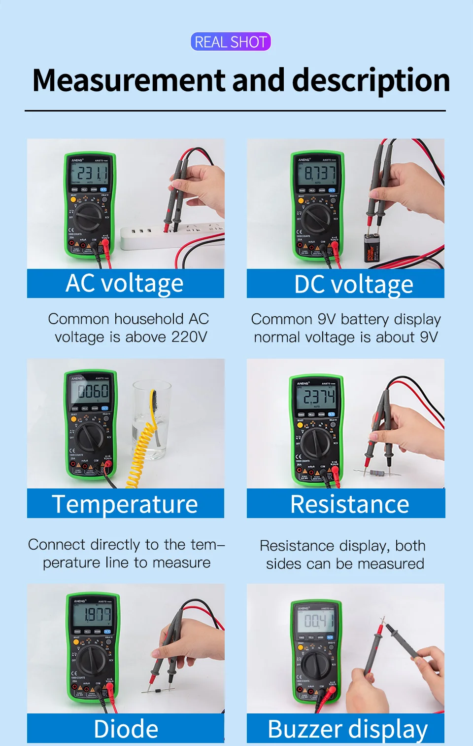 Цифровой мультиметр AN870, автоматический мультитестер с разрешением 19999 отсчетов, True-RMS, Бесконтактный индикатор напряжения, амперметр для переменногопостоянного тока, транзистор, измеритель мощности, тестер температуры