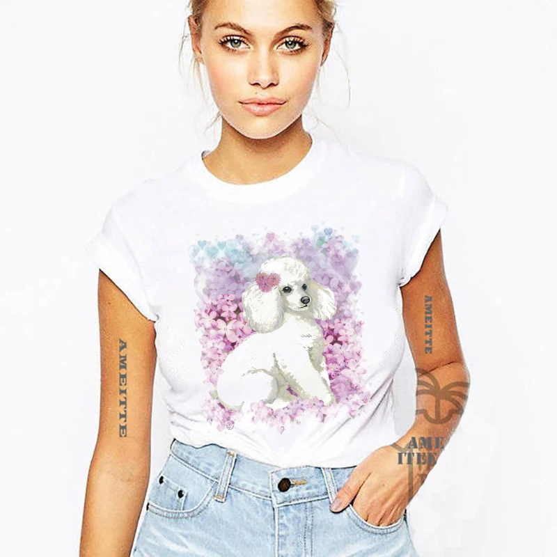 Футболка женская с коротким рукавом, белый художественный смешной Рисунок пуделя в сиренях, повседневная Милая рубашка для девушек