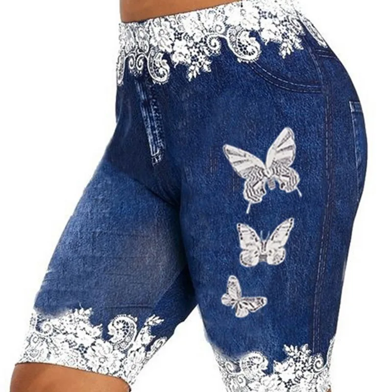 Размера плюс женские шорты для йоги, леггинсы, имитация денима, короткие штаны, летние женские шорты с цветочным принтом и высокой талией