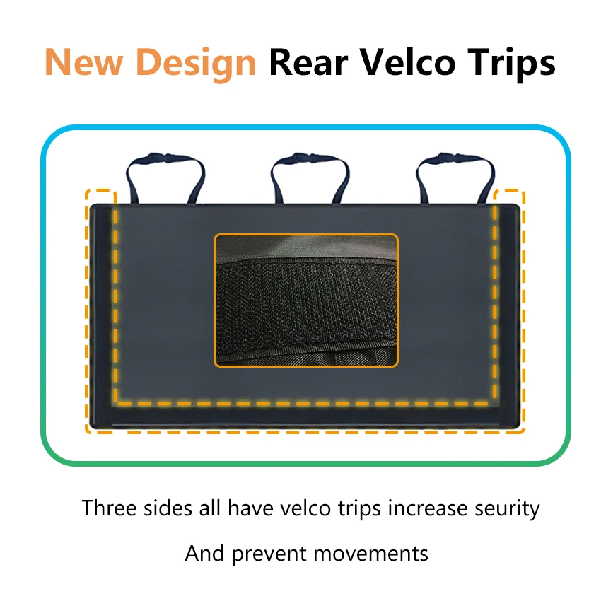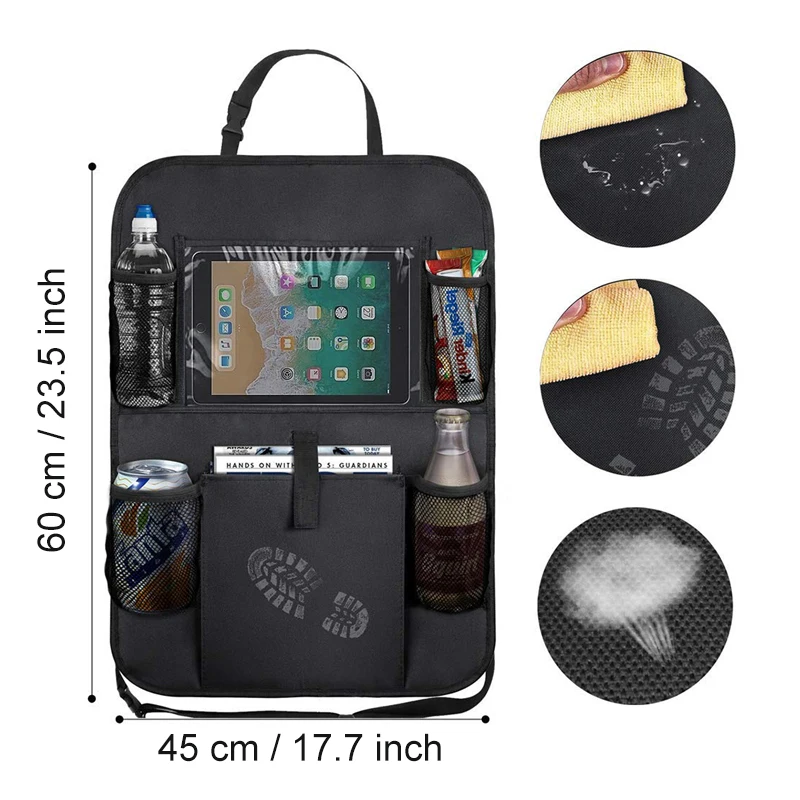 Mesh bags at both sides to store drinks, power bank etc; 3 compartments, which you can store books, magazines, snacks and etc. The extra-long, adjustable straps with quick-release buckles give a universal quick fit in any vehicle.