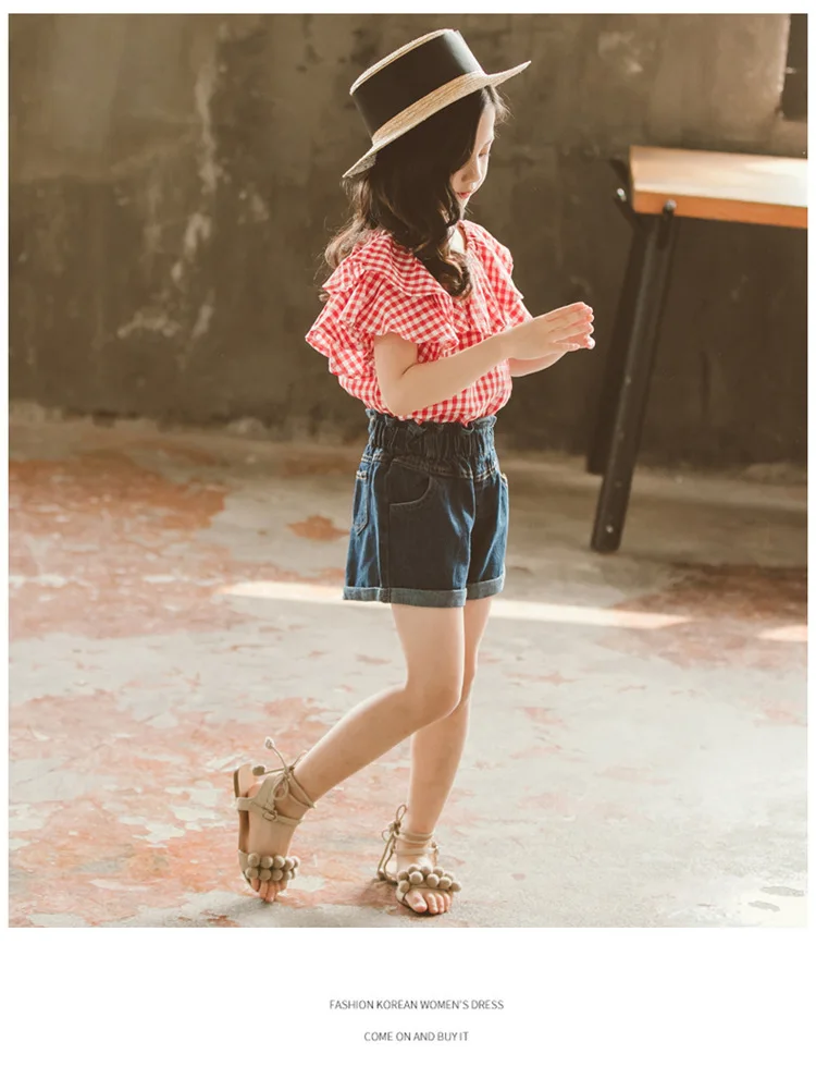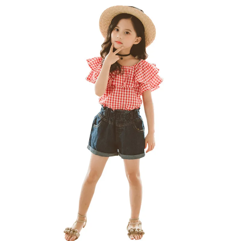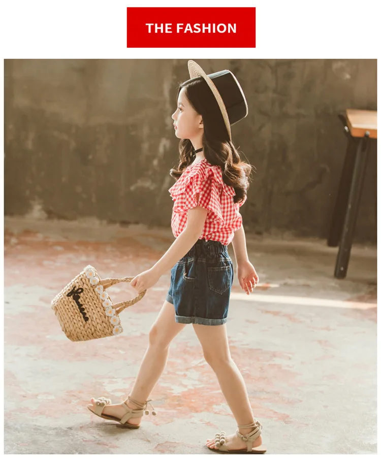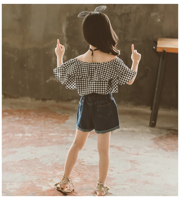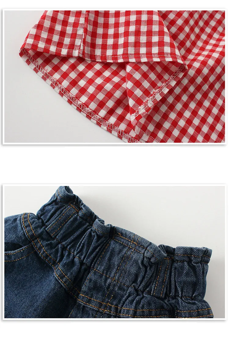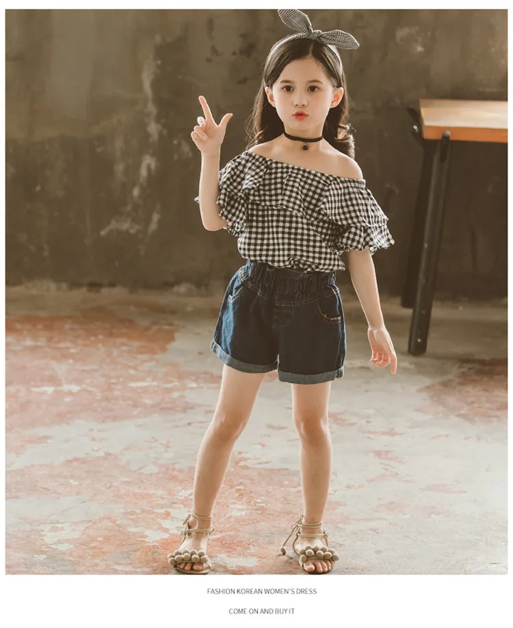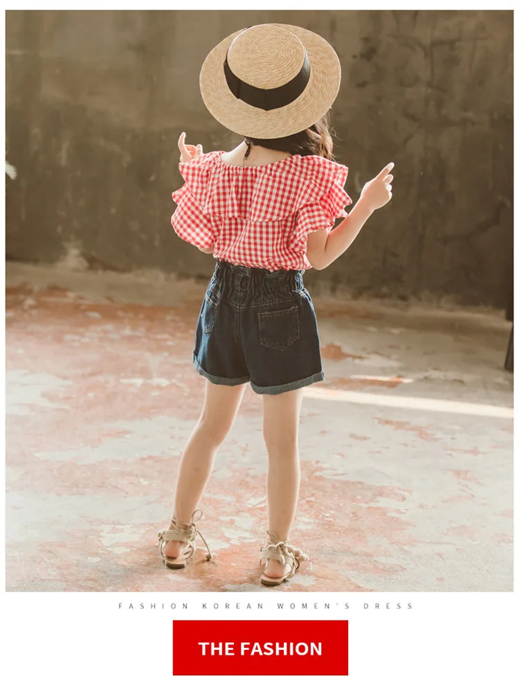 Детская летняя одежда клетчатые топы с оборками, джинсовые шорты Детская одежда хлопковые синие джинсы для малышей короткие комплекты для девочек-подростков