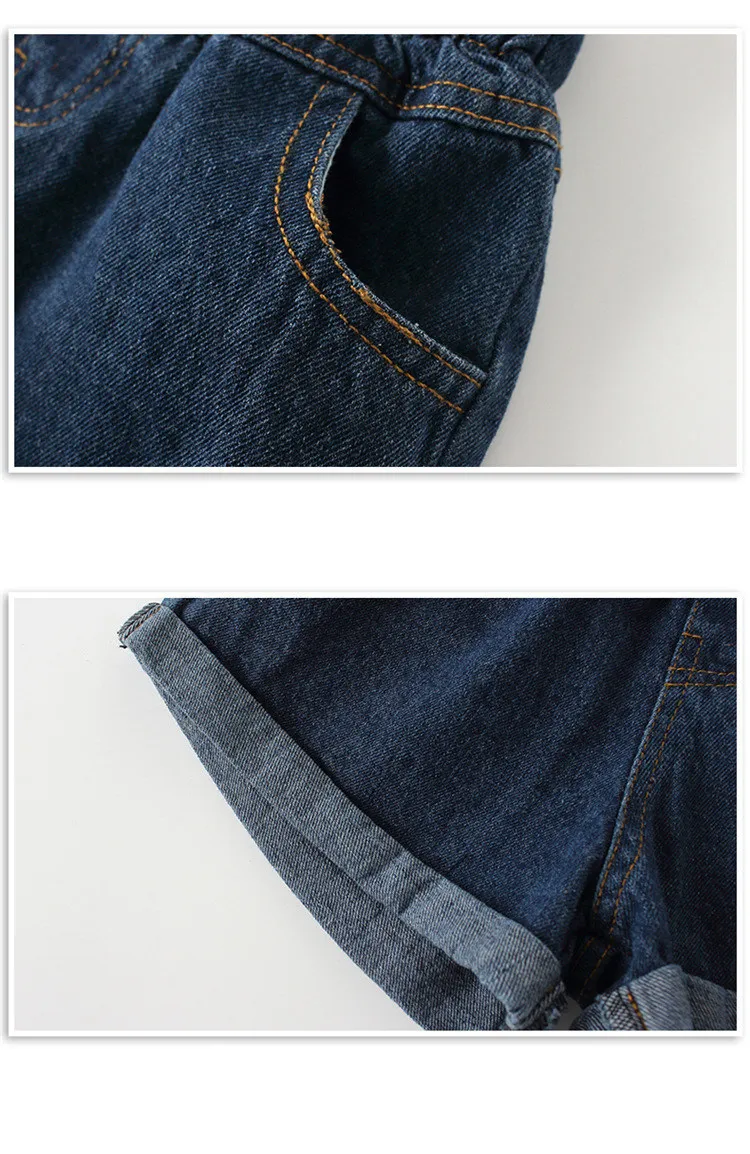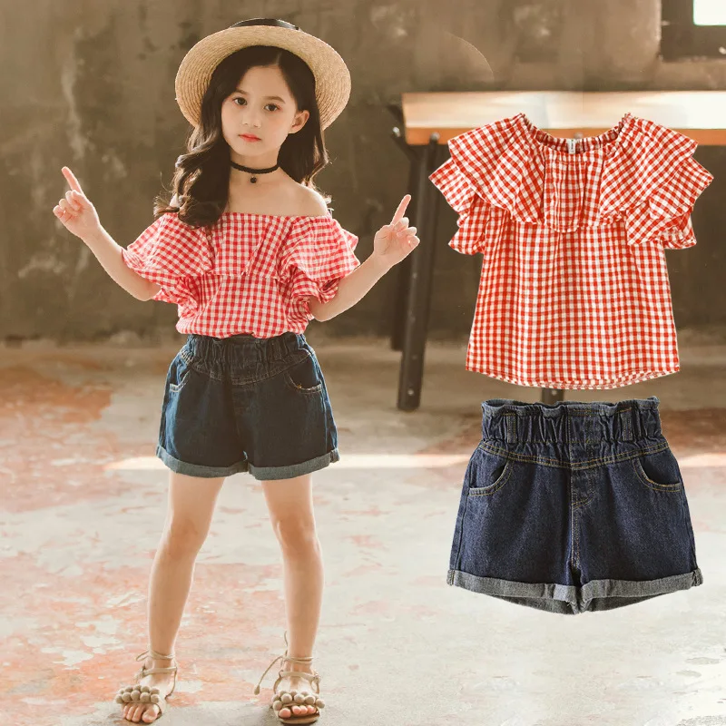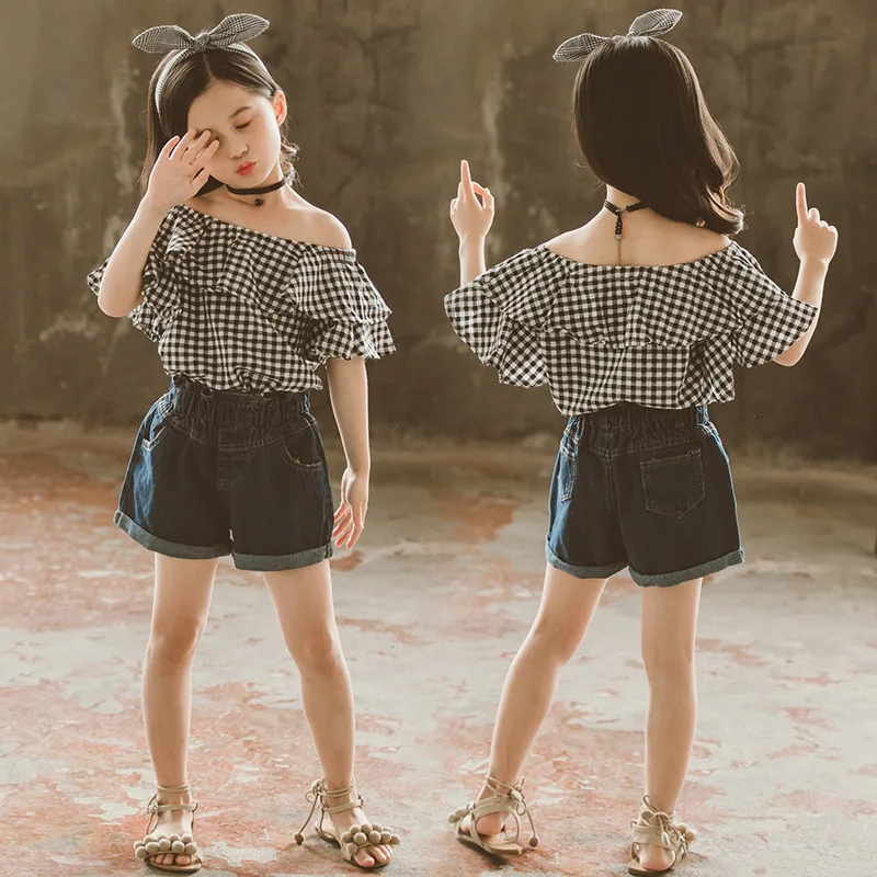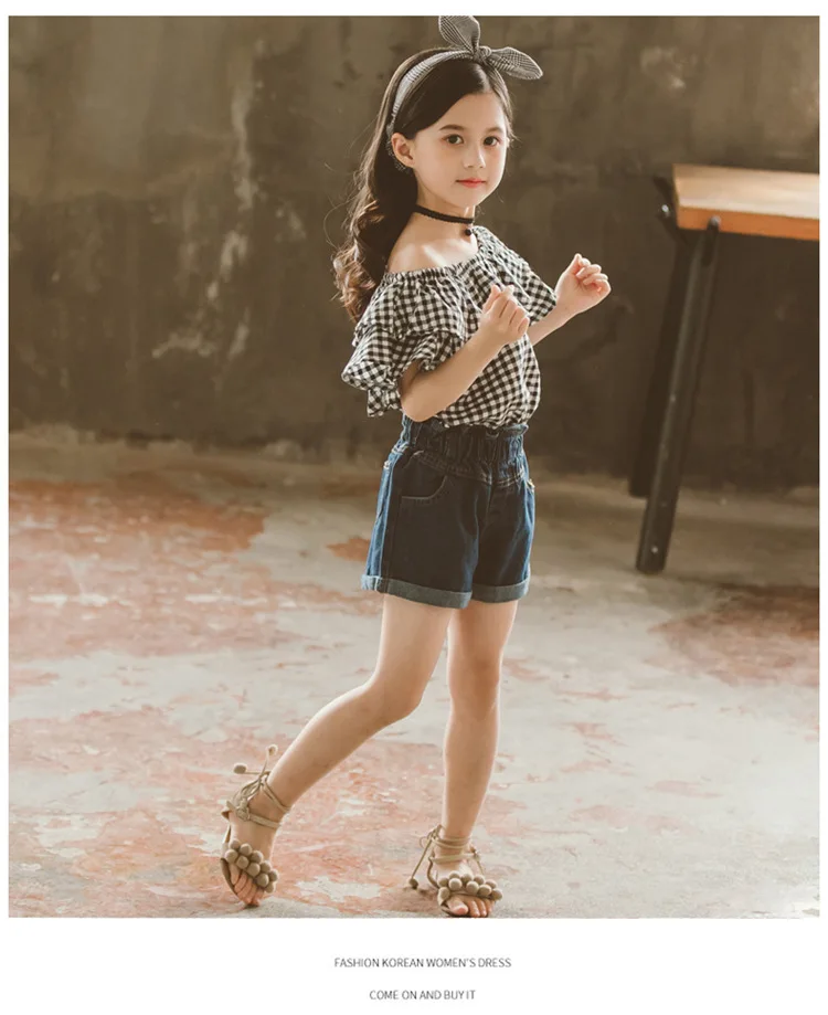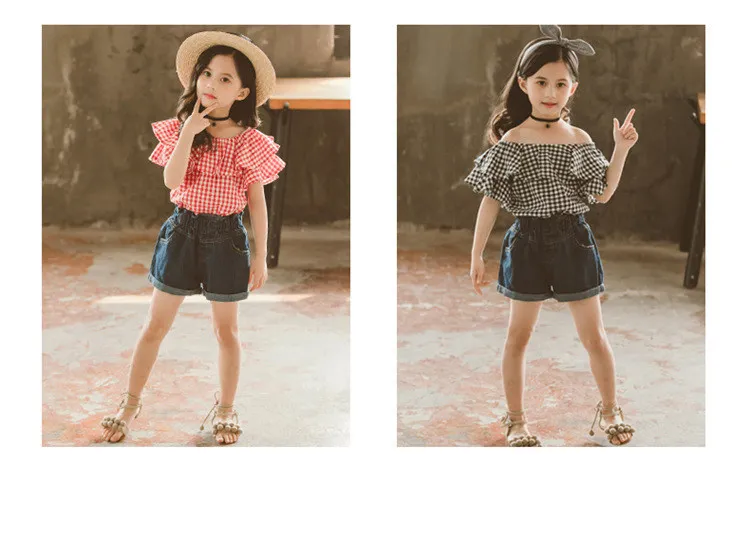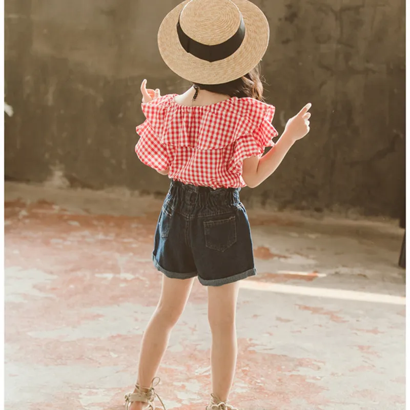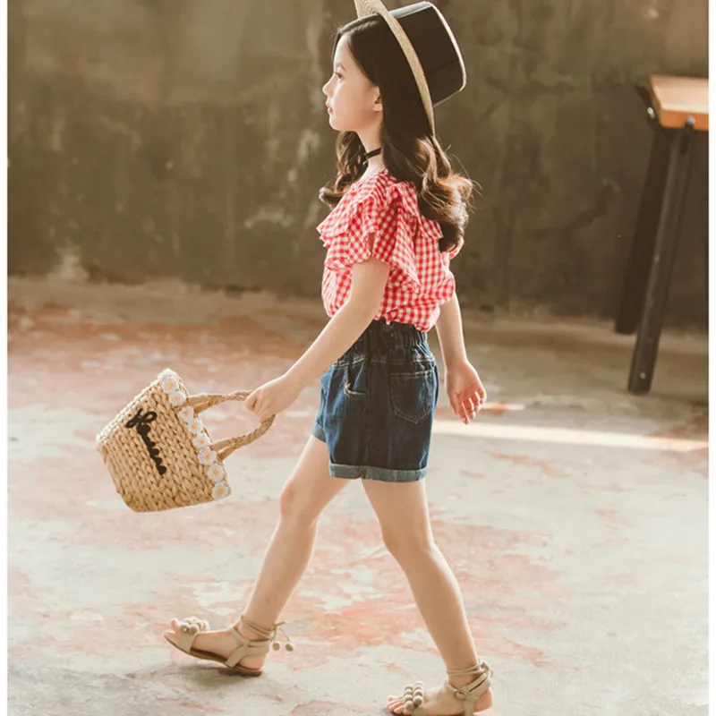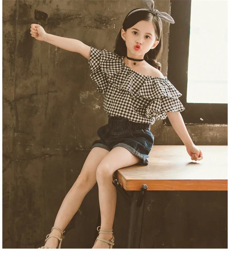 Детская летняя одежда клетчатые топы с оборками, джинсовые шорты Детская одежда хлопковые синие джинсы для малышей короткие комплекты для девочек-подростков