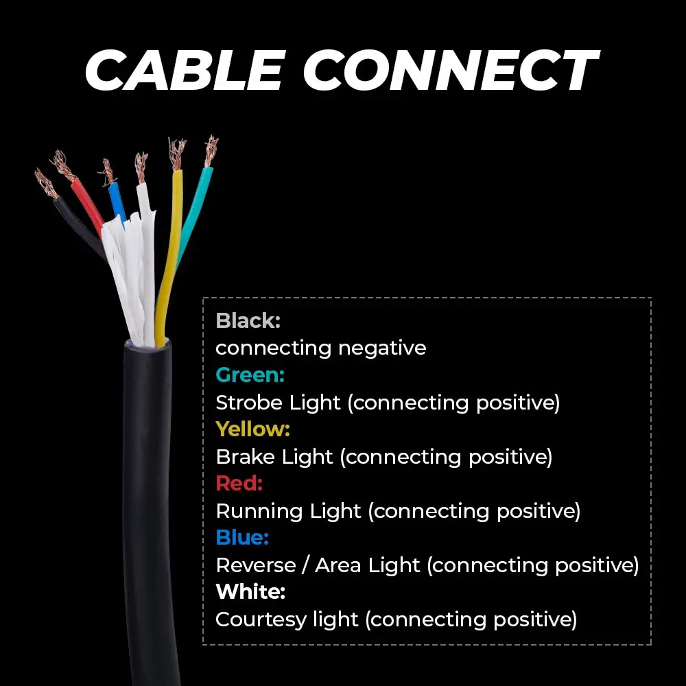 Стробоскосветильник зеленый кабель Встроенная мигалка для гоночных приложений Стосветильник-желтый кабель Дополнительная безопасность для ночных аттракционов Ходосветильник-красный кабель Можно привязать к задним фонарям Кабель заднего хода/зосветильник-голубой Задний фонарь 715 люмен, белый фонарь заднего хода/зоны Кабель подсветки-белый Белые светодиоды направленного вниз 168 люмен
