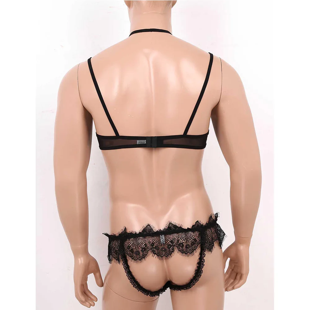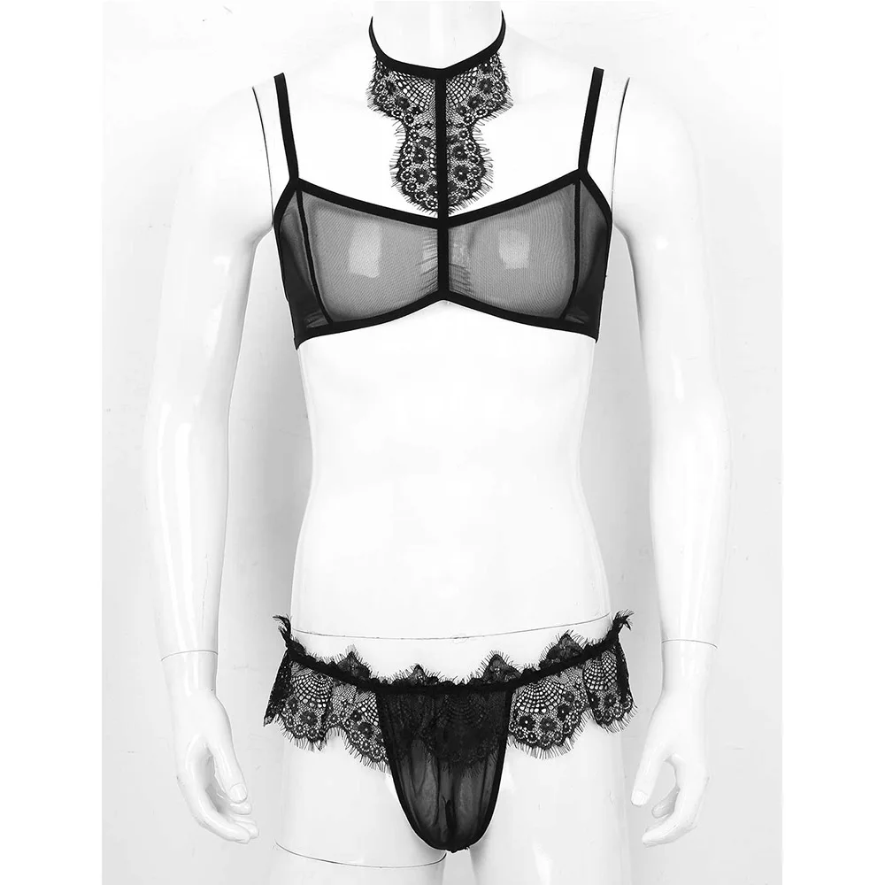 Мужское эротическое нижнее белье Sissy, комплект из прозрачного сетчатого кружевного нижнего белья для геев, сексуальное прозрачное нижнее белье для кроссдресса, топы с трусиками