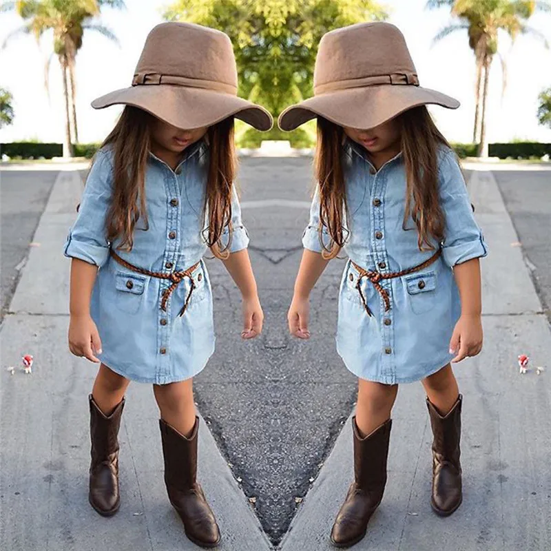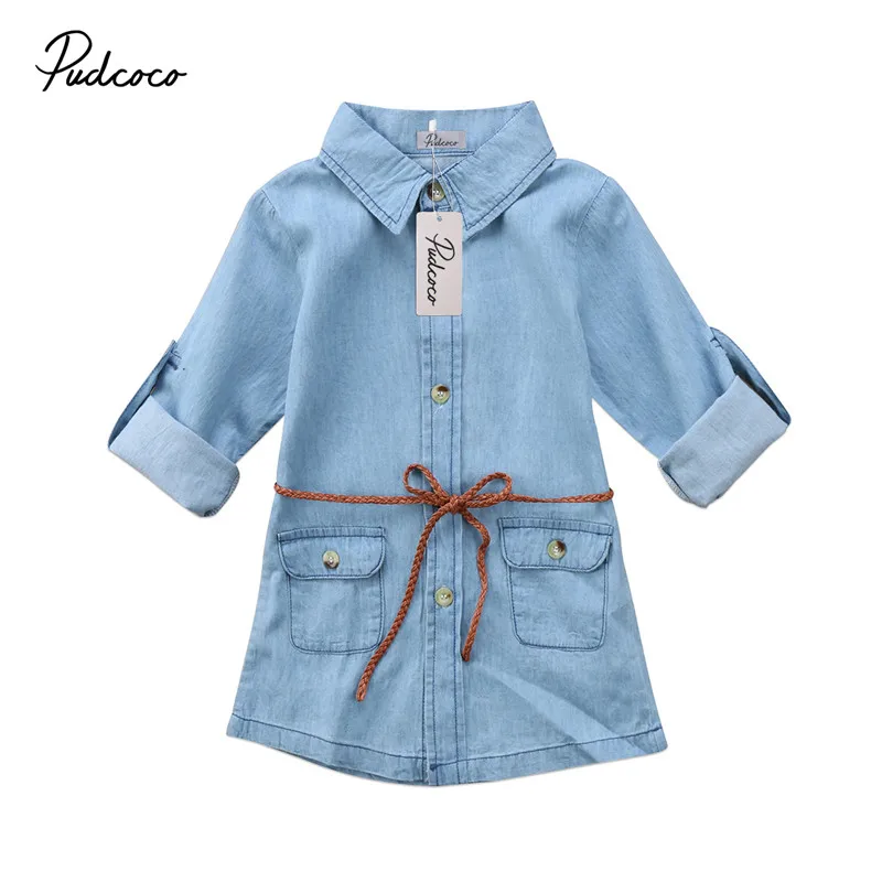 Новинка 2019, От 2 до 7 лет Одежда для маленьких девочек, джинсовые короткие мини-платья с длинным рукавом и поясом, милые Повседневные Вечерние платья-рубашки для девочек