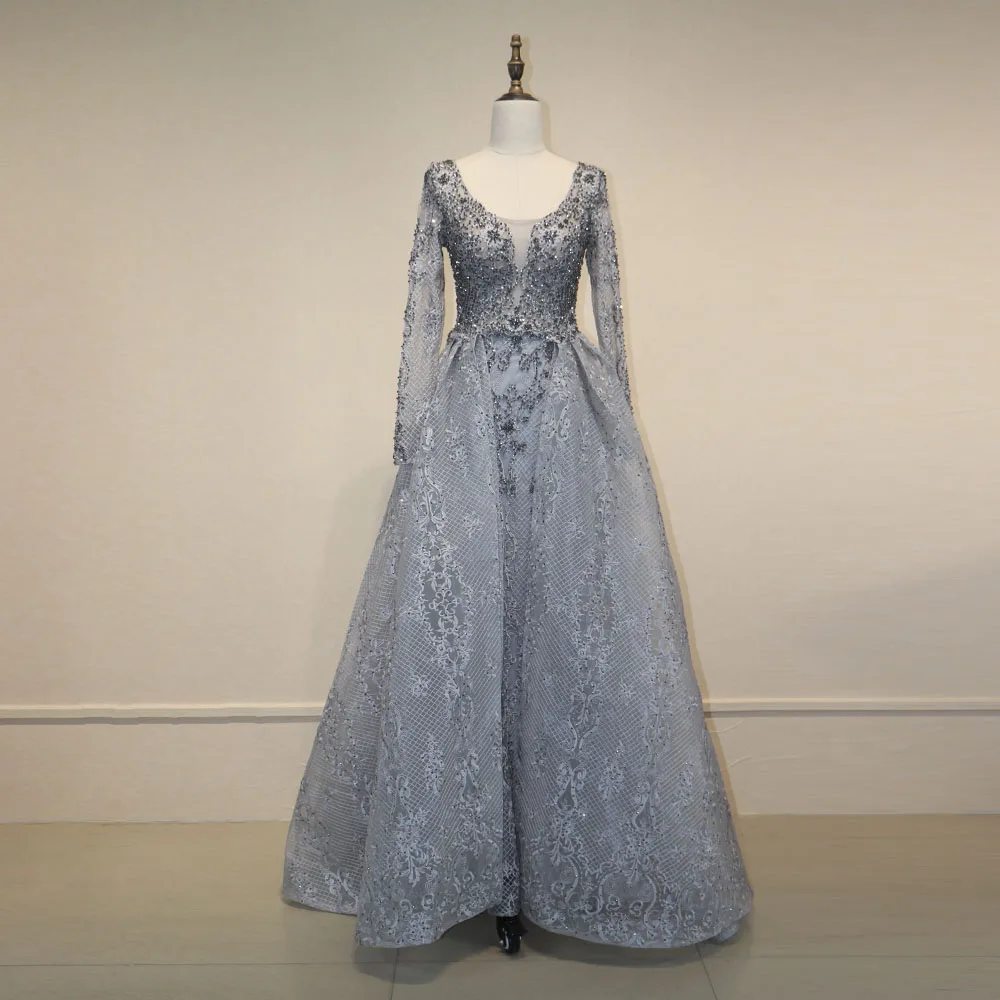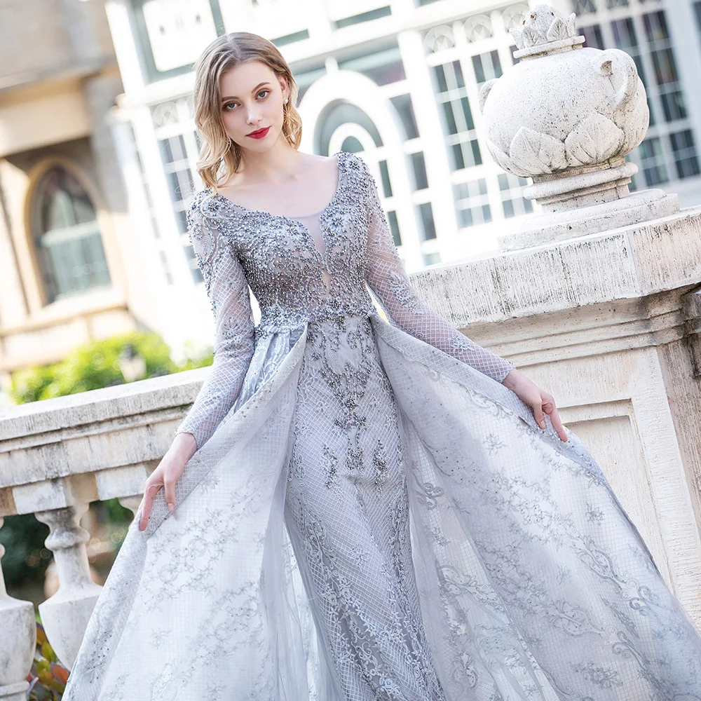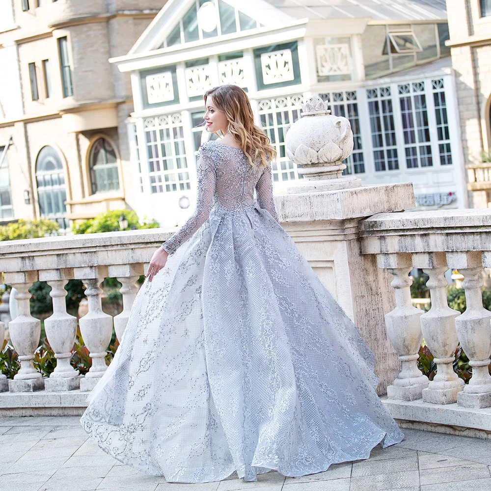 Мода 2020, серебряные мусульманские Вечерние платья с длинным рукавом, вырез лодочкой, вышитые кружева, кристаллы, официальное бальное платье, женское вечернее платье