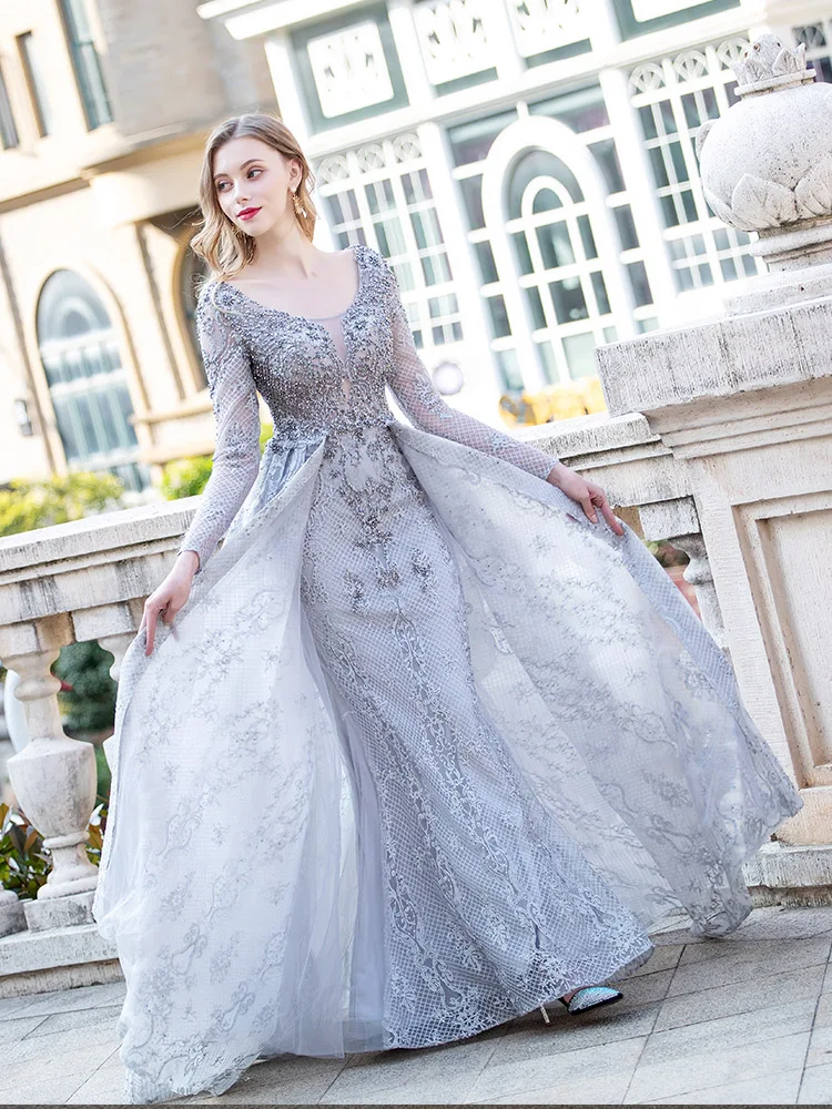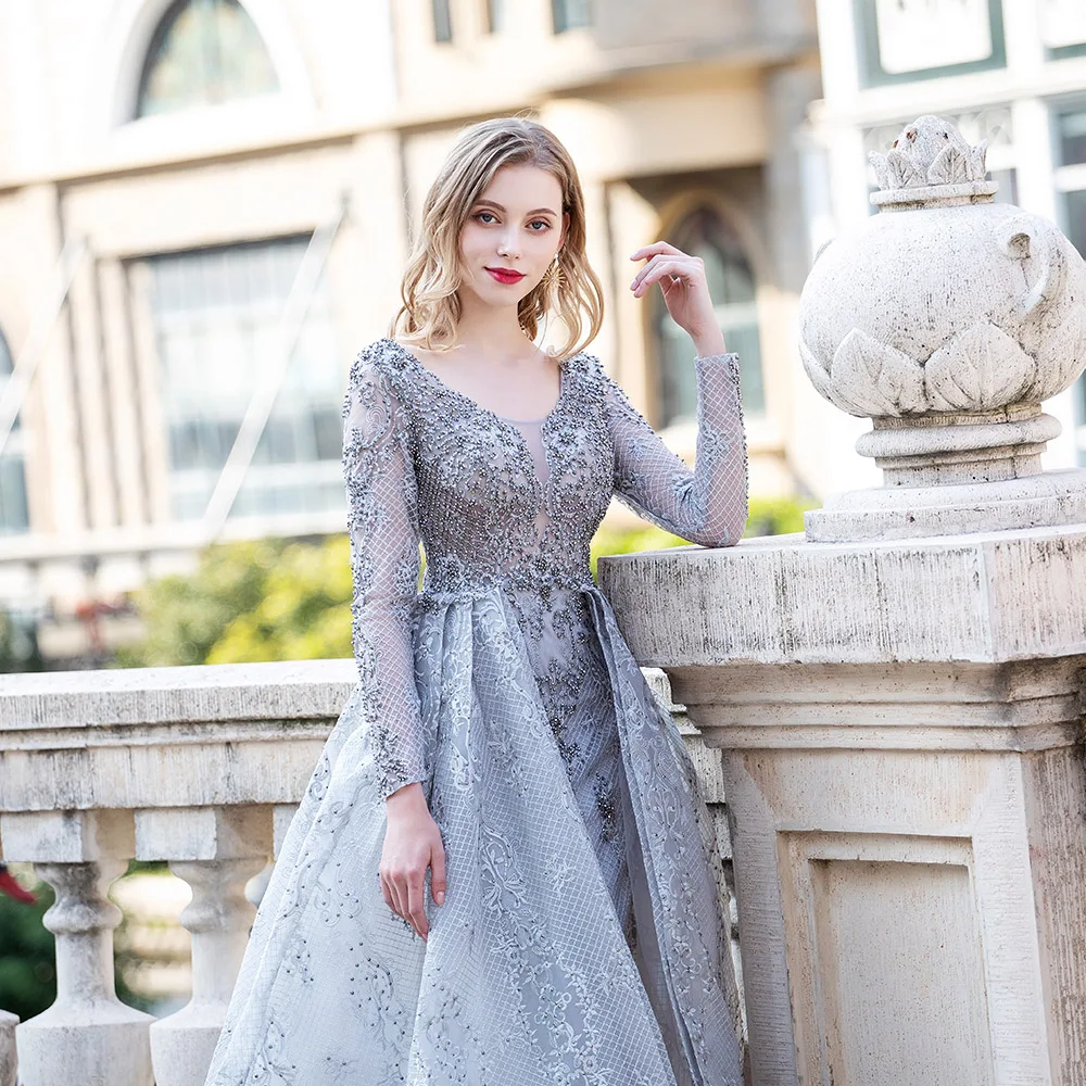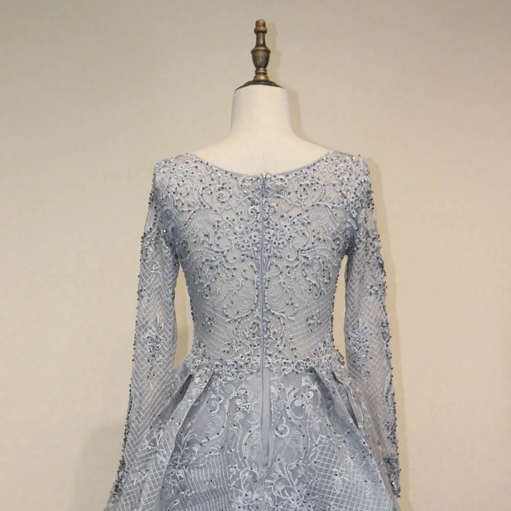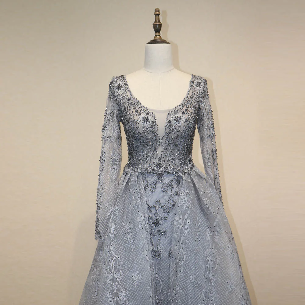 Мода 2020, серебряные мусульманские Вечерние платья с длинным рукавом, вырез лодочкой, вышитые кружева, кристаллы, официальное бальное платье, женское вечернее платье