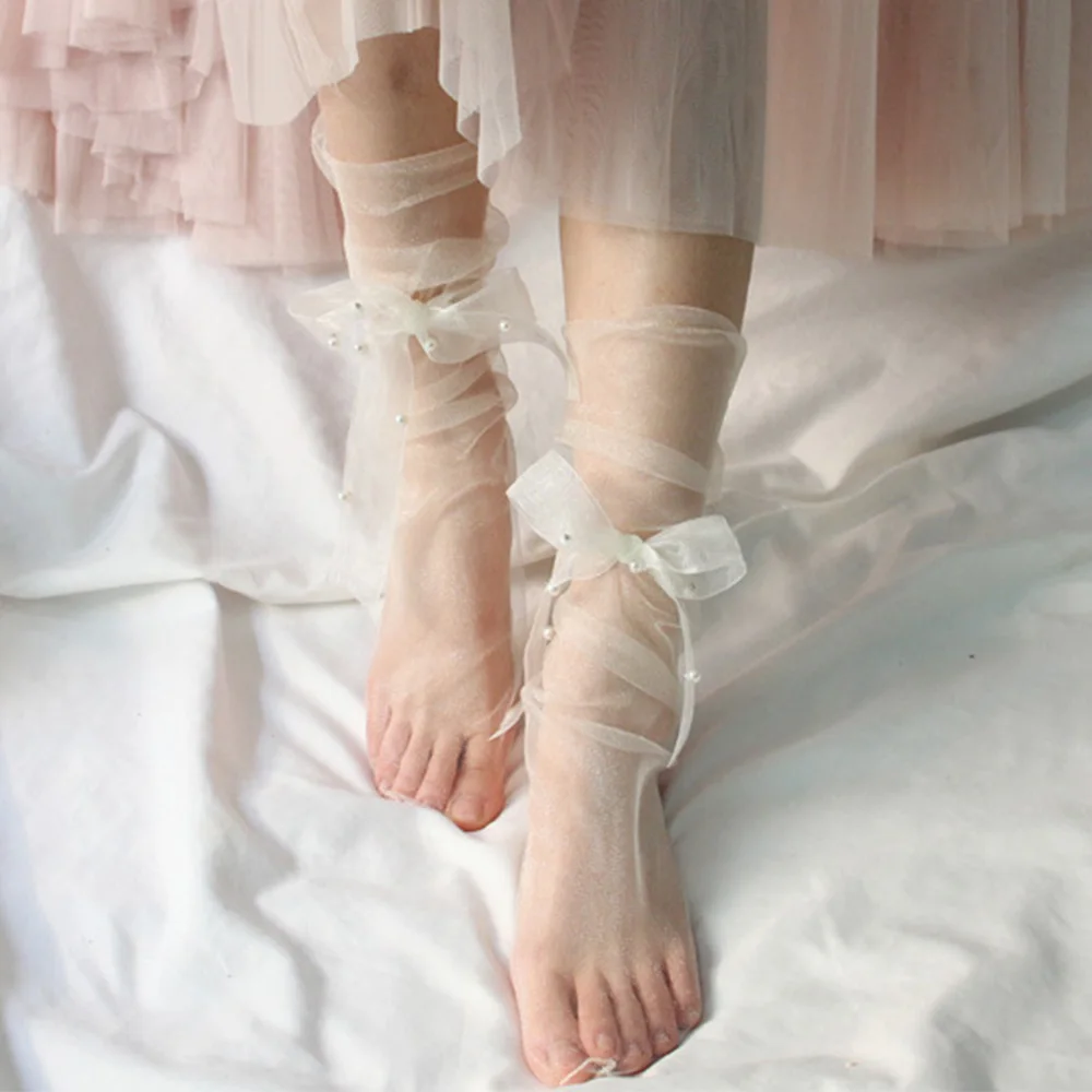 Носки женские, летние, ультратонкие, из тюля, прозрачные, с жемчугом