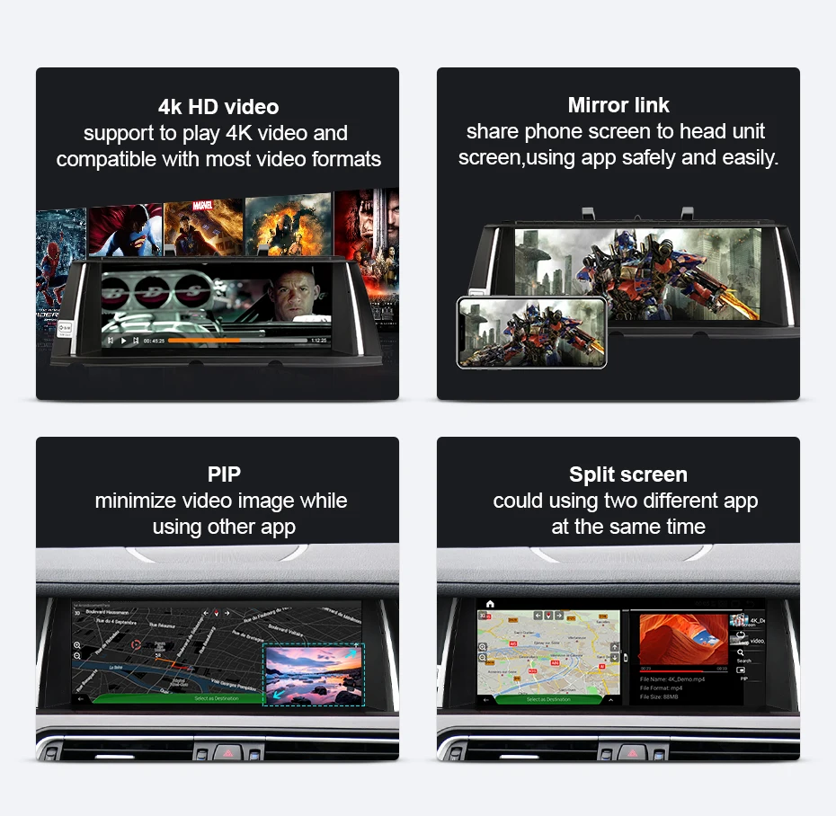 >>> поддержка воспроизведения 4K видео и компиляции с большинством видео форматов >>> Зеркальная ссылка, разделите экран телефона iphone / android на экран головного устройства, используя приложения безопасно и безопасно. >>> PIP. может минимизировать видеоизображение при использовании другого приложения. >>> Режим разделенного экрана. может использовать два разных приложения одновременно.
