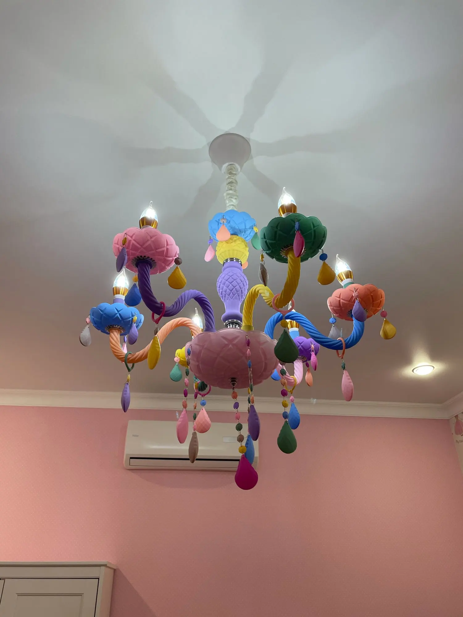 Люстра просто бомба, но по существу: Плюсы: - Упакована на случай ядерной войны. Всё пришло в целости и сохранности. Доставка до Москвы за 3 дня. - Все элементы из стекла! Пластиковая только пипка в самом низу с петелькой под подвеску. Всё покрашено матовой краской во все цвета радуги, без прогалов и потёртостей. - Изготовлена очень добротно, ломаться просто нечему. Минусы: - Инструкция бесполезна от слова СОВСЕМ. Сборка велась по фото. - Ключа для сборки нет, так что запаситесь. - Самый главный недостаток - лампы попались "редкостное борохло", и это очень мягко сказано. Светить наверное должны ярко, но нет... Более того, как минимум в одной явный дефект, и при включении люстры вырубает центральное УЗО на 300 mAm/h. Думаю, есть косяк с резистором, или просто пробивает. Теперь резюме: самая крутая люстра на сайте!!! Ничего круче найти просто НЕВОЗМОЖНО!!! Перерыл все магазины, в том числе и интернет, но лучше люстры для девчачей детской не нашёл, тем более за такие деньги! Продолжение.