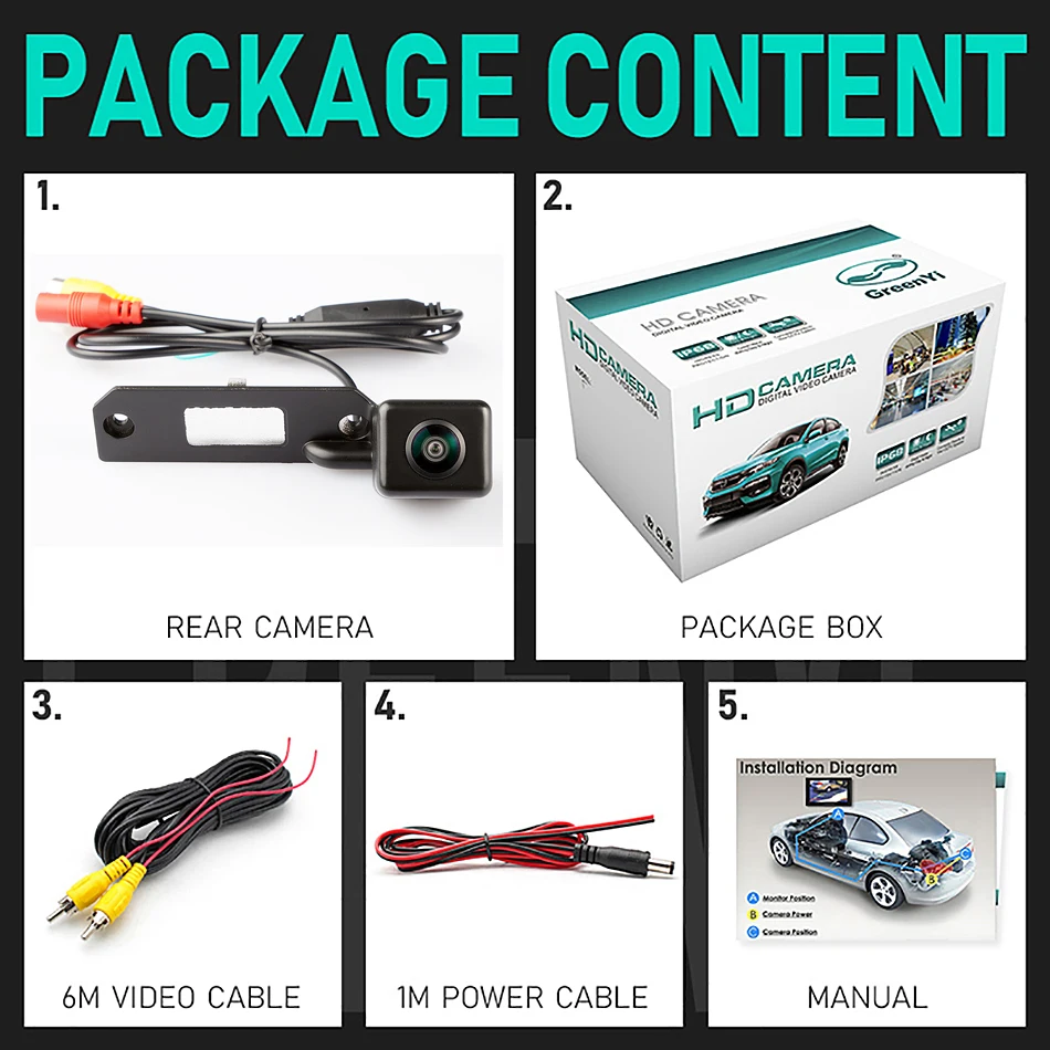 1. Камера заднего вида FS-HD 2. Самонарезающий винт и коробка 3. Видеокабель 6 м 4. Кабель питания 5. Руководство