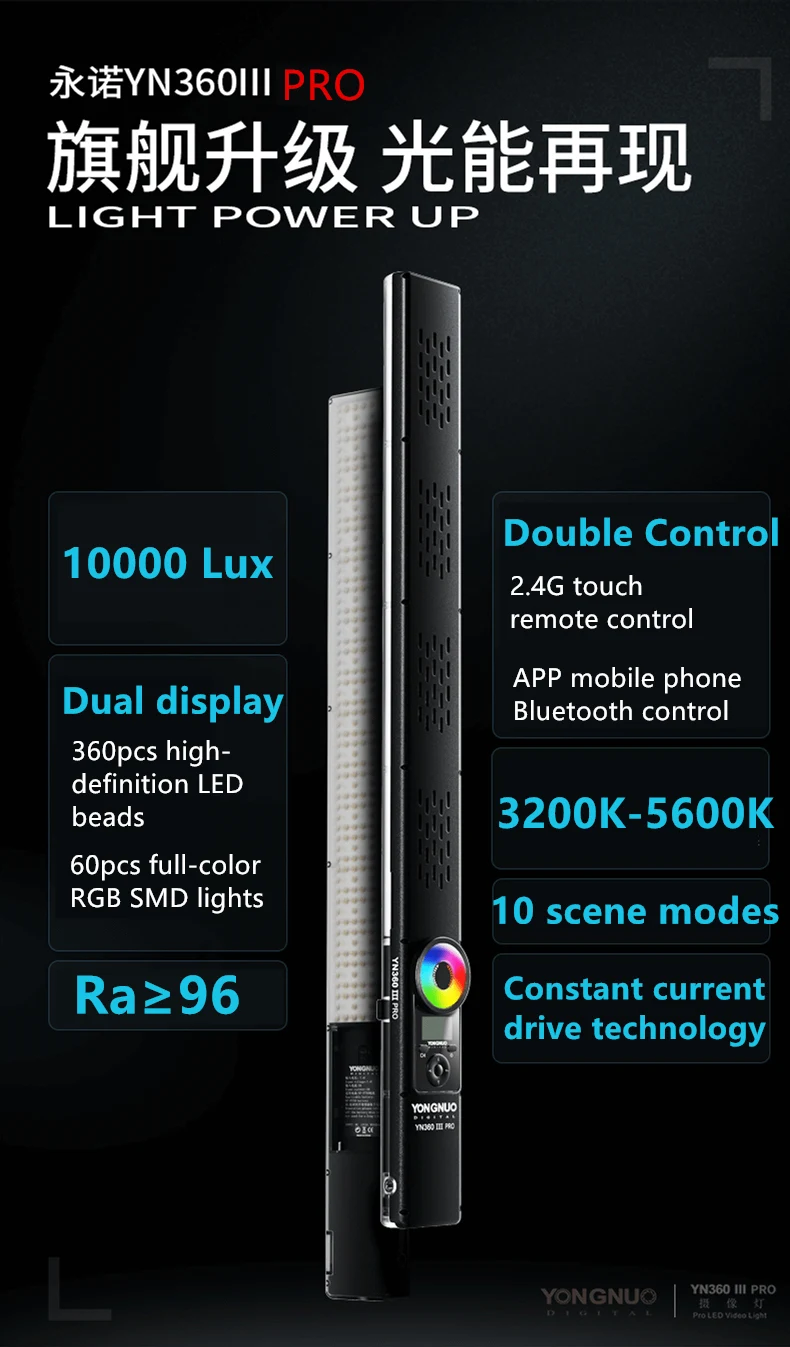 Yongnuo YN360III Pro ручной светодиодный светильник для видео с сенсорным регулированием Bi-colo 3200k до 5500k RGB заполняющий светильник с пультом дистанционного управленияYN360III Pro 5500KОснащен фирменным пультом дистанционного управления с сенсорной панелью, через сенсорную панель на пульте, режим освещения и яркость можно легко регулировать, сигнал срабатывает на ощупь, функция затемнения является точной и надежной, что легко достичь требуемого дополнительного эффекта освещения.С YN360III вы можете имитировать 10 различных специальных дополнительных режимов освещения, таких как молния, восход солнца, мигающие огни полицейских транспортных средств, чтобы лучше удовлетворить требования пользователя.Состоит из цветного полноцветного режима RGB и естественного заполняющего светильник 3200k, цветового температурного режима 5600k, двух режимов автономной работы, легко переключаться в требуемый режим с помощью одной кнопки. Поддерживает беспроводной триггер вспышки YONGNUO светодиодный Беспроводная система управления, YN360III может осуществить взаимное общение и синхронной функции управления с другими Светодиодная лампа для видеосъемки YONGNUO светодиодный свет.Обеспечивает полный цвет RGB, вы можете не только получить заполняющий светильник с различными цветами через сенсорную панель дистанционного управления, но и выбрать свой собственный уникальный цвет через цветовую палитру в приложении на мобильный телефон.В YN360III ламповая панель длиной до 40 см, значительно расширения светильник угол, который очень подходит для стерео и широкоугольный светильник дополнение. Принимает 360 хорошо подобранных высококачественных лампочек с большим светящимся чипом, индекс цветопередачи больше или равен 95, YN360III может идеально восстановить истинный цвет объекта.YN360 III Модернизированный Pro светодиодный видео светильникДва режима питания1. Применимый аккумулятор: NP-F550, NP-F750, NP-F9702. Поддерживает внешний источник питания постоянного тока для длительного использования, применимое напряжение: 12 В 2A (пожалуйста, не используйте источник питания ноутбука).* Принимает Светодиодная лампа для видеосъемки YONGNUO светодиодный Постоянное Текущее Вождение технологии специально разработан для светодиодный видео светильник, светильник Выход работает стабильно и интуитивно понятный, фотографический эффект более надежна.ПараметрыЦветовая температура: 3200K, 5600K и RGB полный цветИндекс цветопередачи: больше или равен 95Удаленное Расстояние: менее 15 метровМощность: 21,6 W и 10,8 WСветовой поток: 2790лмВес: около 80 гУгол освещения: 55 градусов и 110 градусовВнешний источник питания постоянного тока: 12 В 2 а постоянного токаРазмер: 583*48*24 мм* Две модели YN360III на ваш выбор, белый цвет-состоит из 360 лампочек 5600K и 60 RGB SMD светодиодов, био-цвет-состоит из 180 ламповых бусин 3200K и 180 ламповых бусин 5600K и 60 RGB SMD светодиодов.YN360III Pro 3200K-5500KОснащен фирменным пультом дистанционного управления с сенсорной панелью, через сенсорную панель на пульте, режим освещения и яркость можно легко регулировать, сигнал срабатывает на ощупь, функция затемнения является точной и надежной, что легко достичь требуемого дополнительного эффекта освещения.С YN360III вы можете имитировать 10 различных специальных дополнительных режимов освещения, таких как молния, восход солнца, мигающие огни полицейских транспортных средств, чтобы лучше у