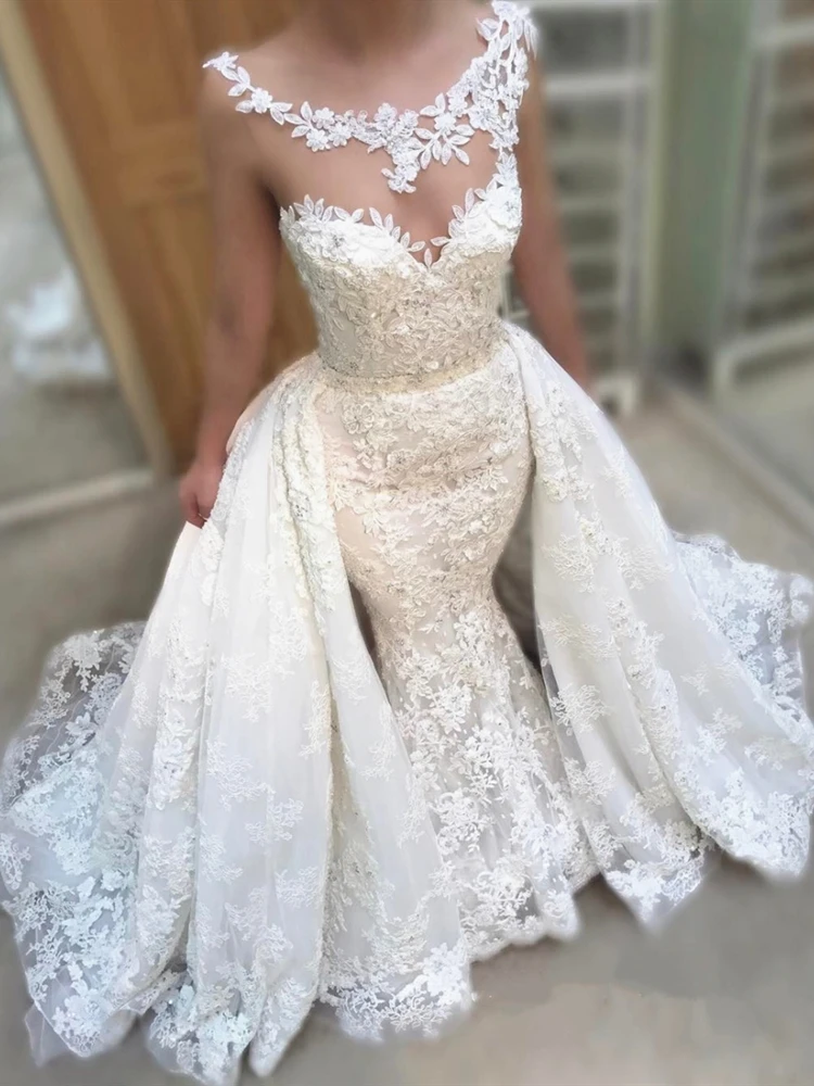 Свадебные платья со съемным шлейфом, 2 предмета, со съемной юбкой, с кружевной прозрачной горловиной, Великолепные Свадебные платья vestido de noiva