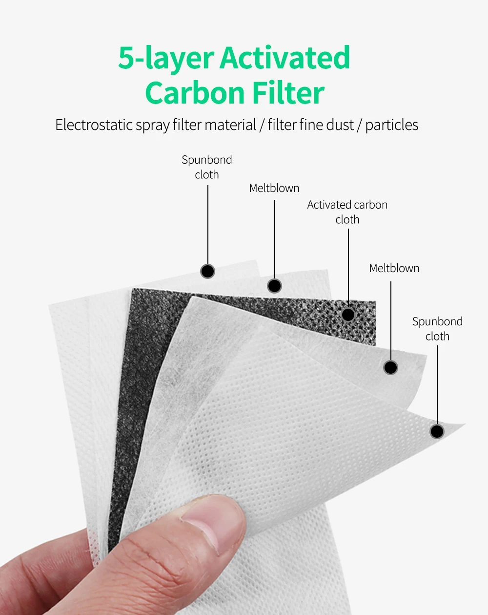Технология фильтрации:Изготовлено из активированного угля и нетканого расплава фильтрующей ткани, пятислойная фильтрующая система эффективно удерживает от PM 2,5 и ряда загрязняющих веществ, переносимых в воздухе;