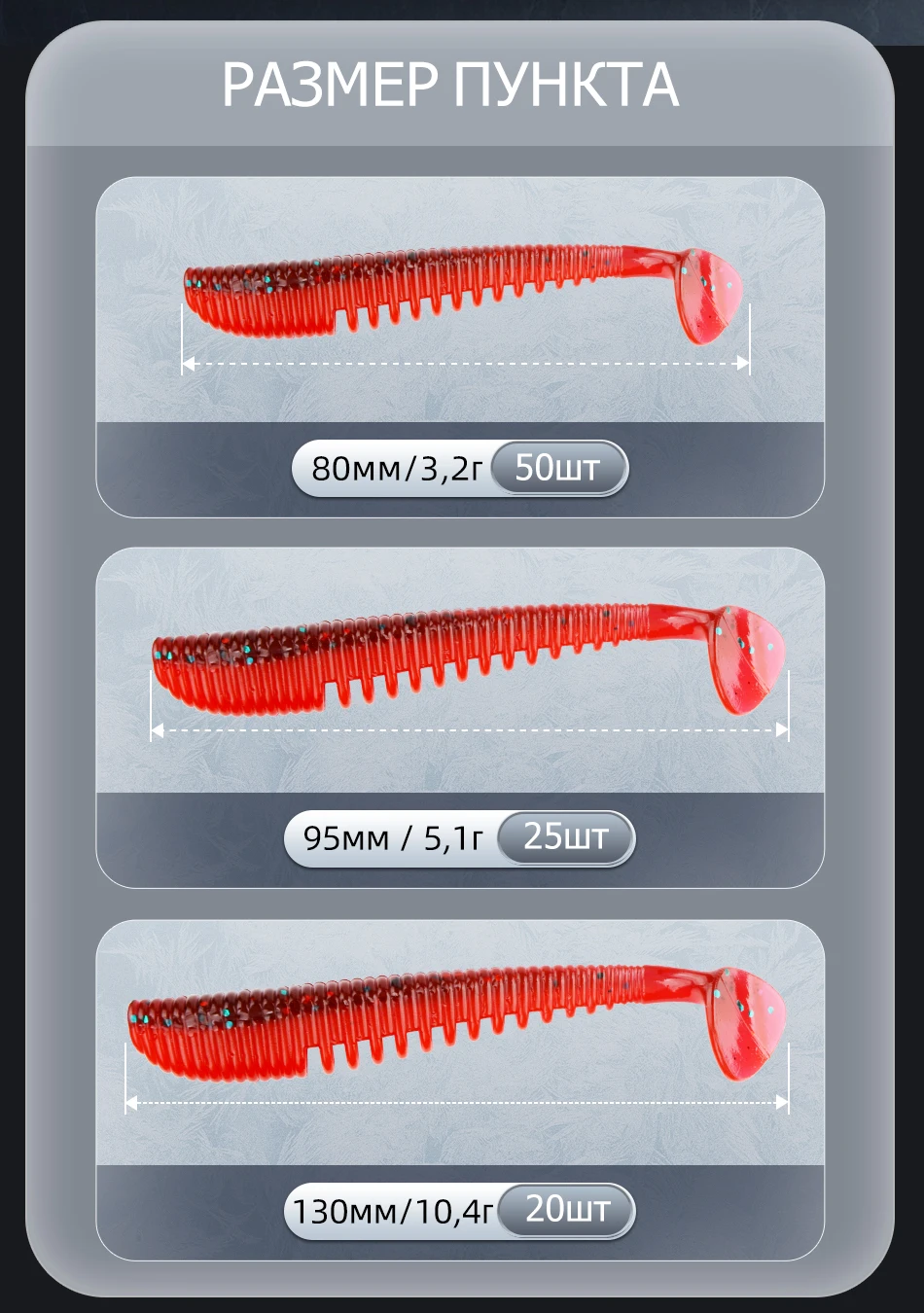 Очень хорошие приманки, мягкий пластик, приятный цвет. Супер быстрый и хороший продавец, просто рекомендую!