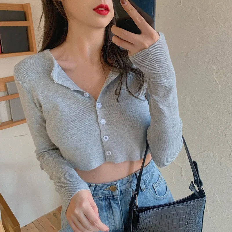 Тонкий женский трикотажный кардиган, сексуальная Однотонная футболка, модная повседневная укороченная футболка с длинным рукавом для женщин