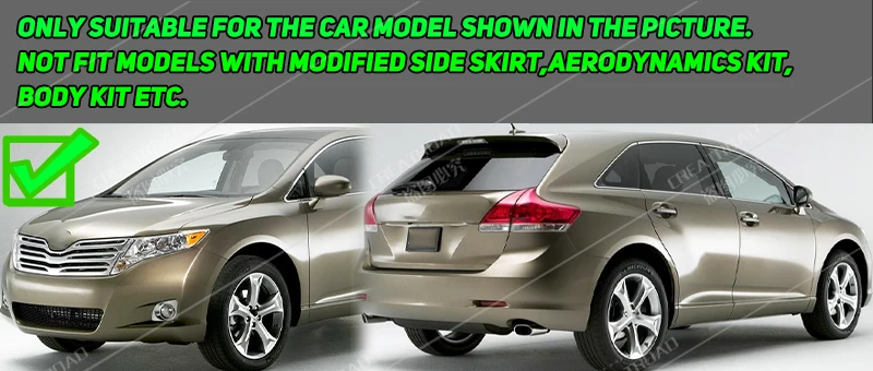 Фитинг: для Toyota Venza (3-го поколения типа) 2009-2016Не совместим с комплектом аэродинамики, боковыми юбками, комплектом для тела и т. д.