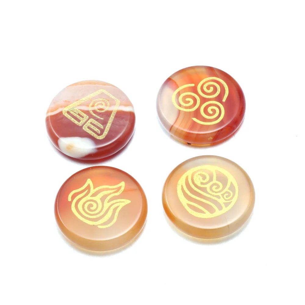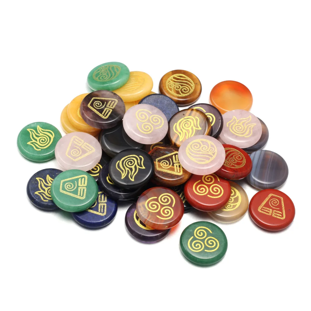 Камни в виде чакр с лазуритом и гравировкой символов круглой формы,...