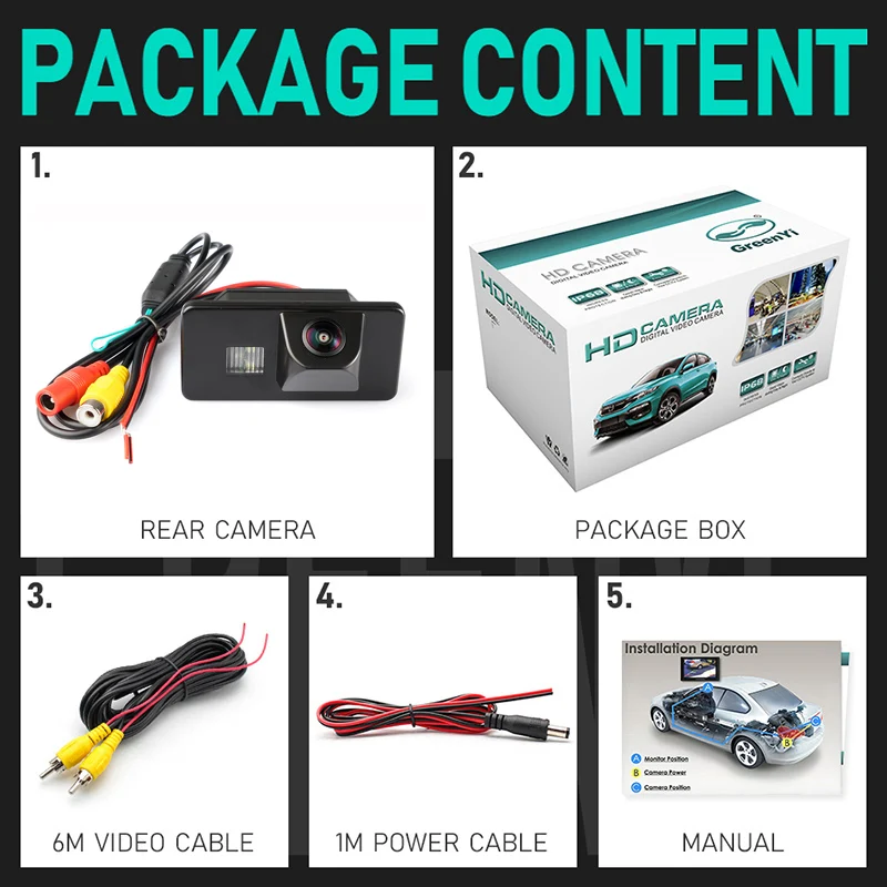 1. FS-HD камера заднего вида2. Саморезы и коробка3. Видео кабель 6 м4. Кабель питания5. Руководство пользователя