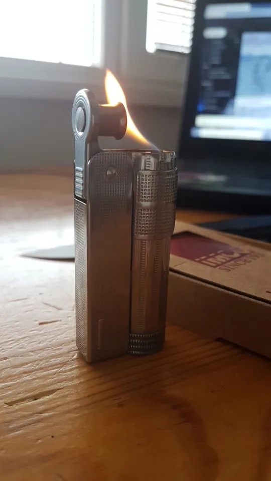 Отлично, я прибываю вовремя и в форме, зажигалка, безусловно, лучшая, которую я получил от этого типа, она никогда не подведет, она всегда включается (пока у нее есть бензин, конечно) это красиво и имеет свое отделение для запасной камня.